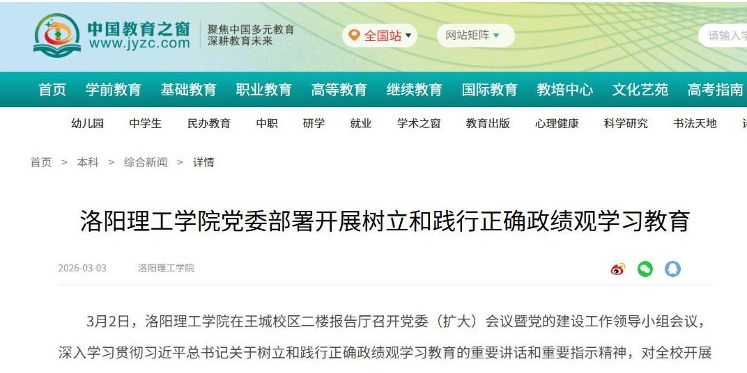 中国教育之窗、高校之窗、河南高教等媒体报道我校党委部署开展树立和践行正确政绩观学习教育