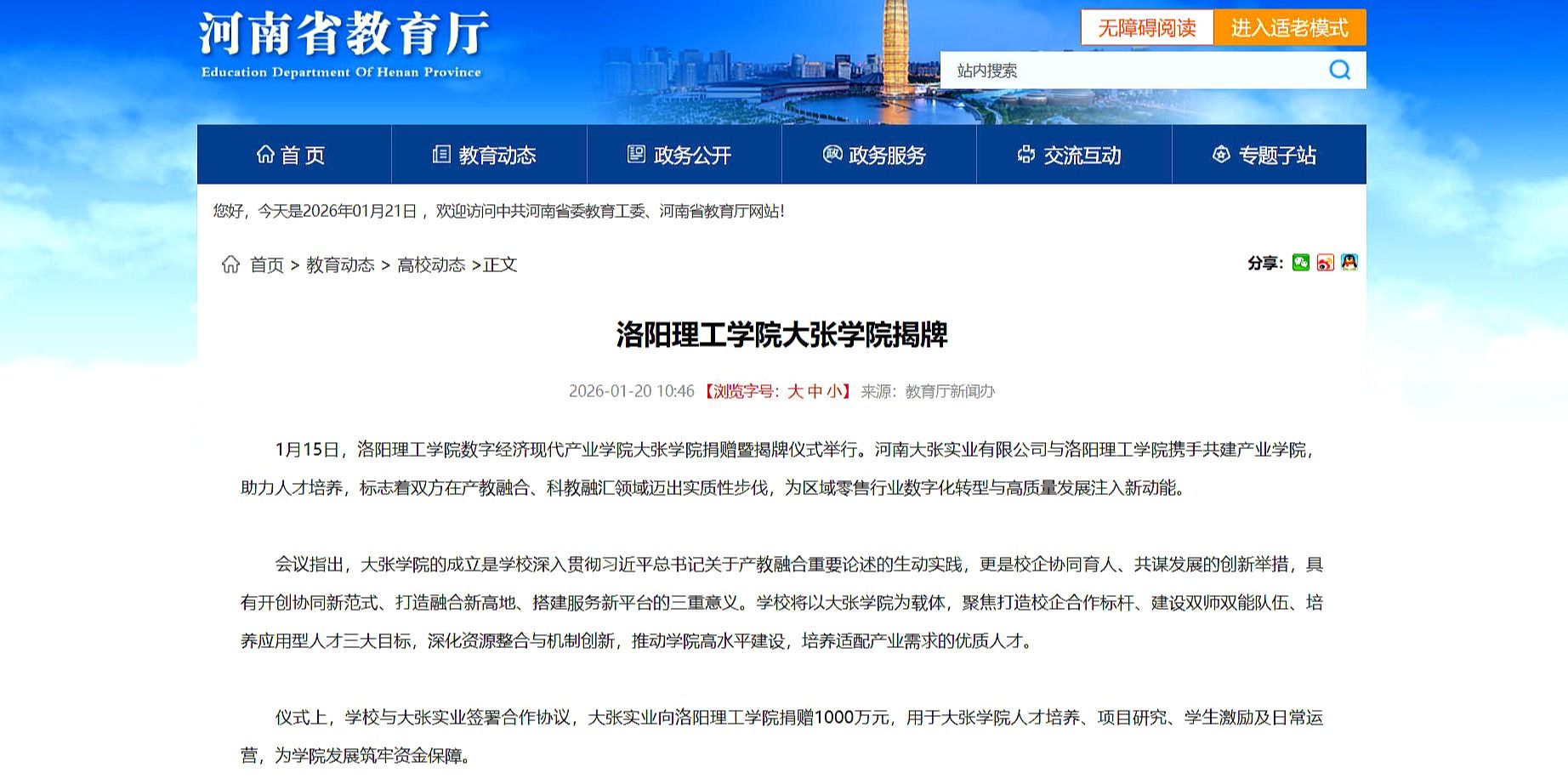 河南省教育厅报道我校大张学院揭牌