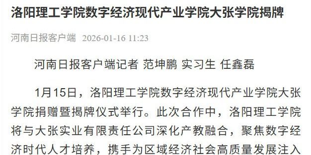 中国教育之窗、中国高校之窗、河南日报、洛阳日报等多家媒体报道洛阳理工学院数字经济现代产业学院大张学院在我校揭牌