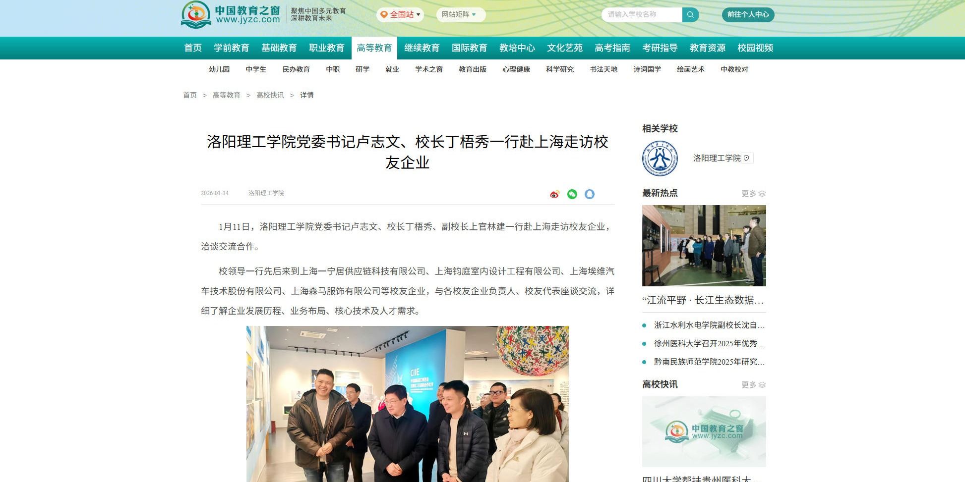 中国教育之窗、中国高校之窗、河南教育宣传网报道我校党委书记卢志文、校长丁梧秀一行赴上海走访校友企业