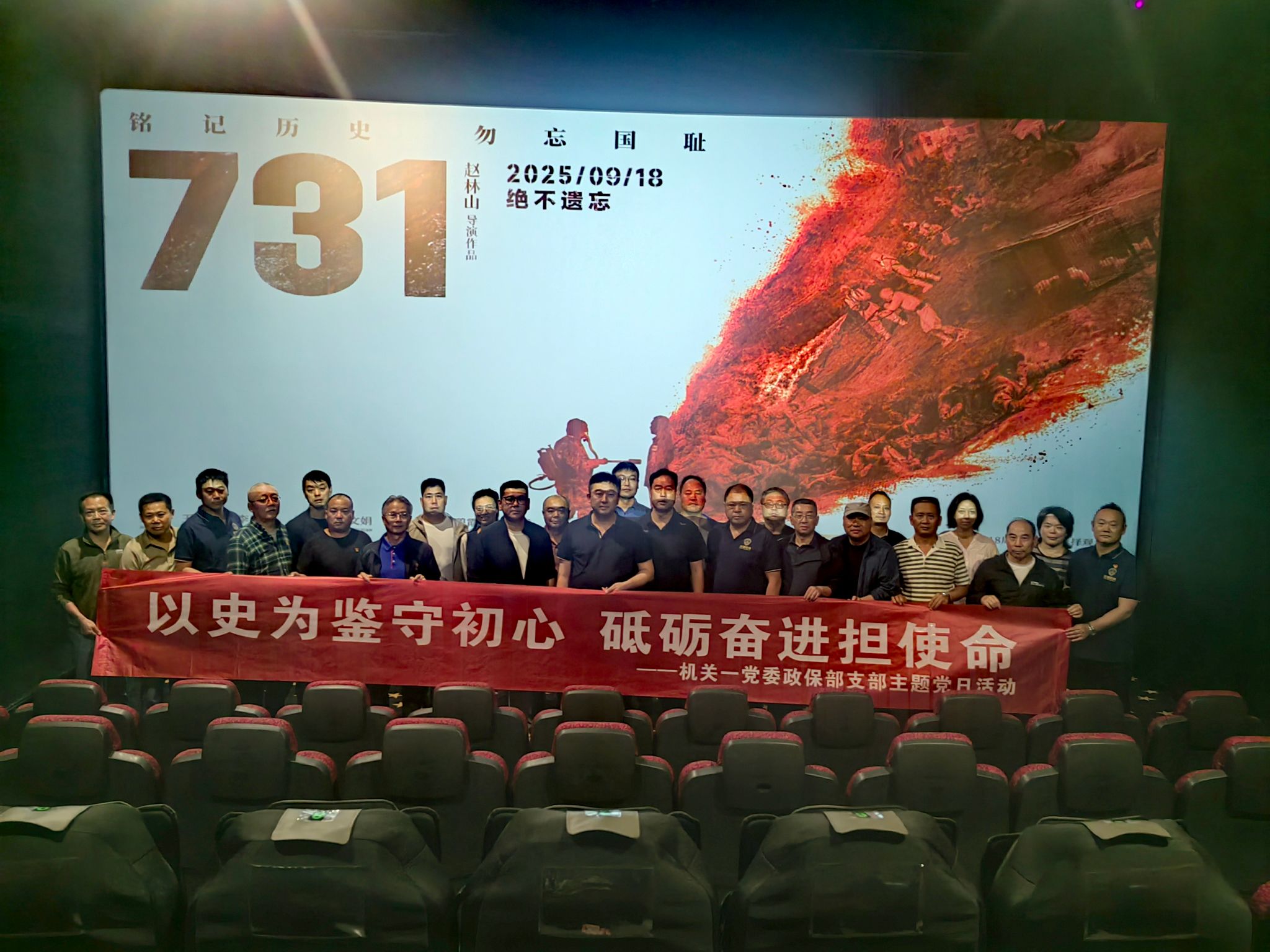 为纪念中国人民抗日战争暨世界反法西斯战争胜利80周年,9月25日,政保部党支部组织全体党员开展“以史为鉴守初心 砥砺奋进担使命”主题党日活动,通过集中观看历史题材电影《731》,在光影流转中重温历史记忆、感悟初心使命。