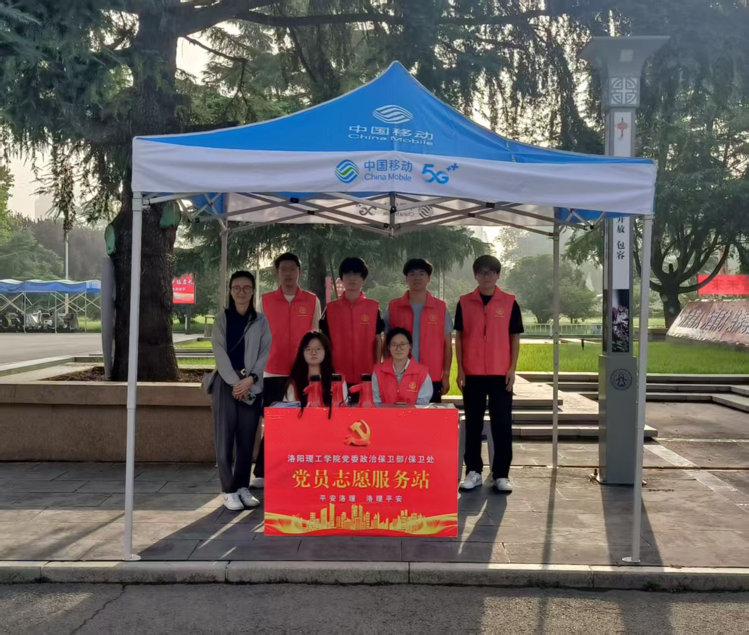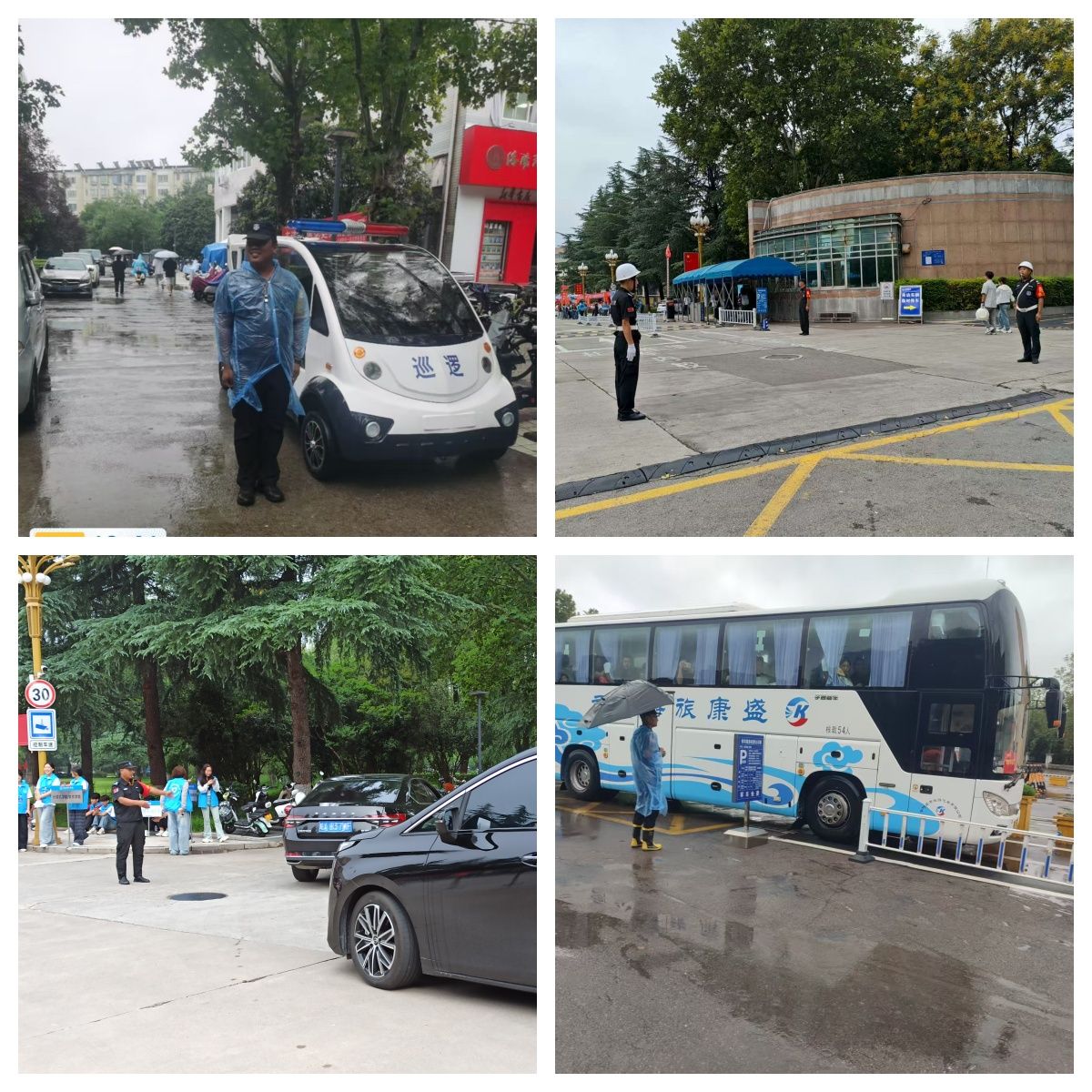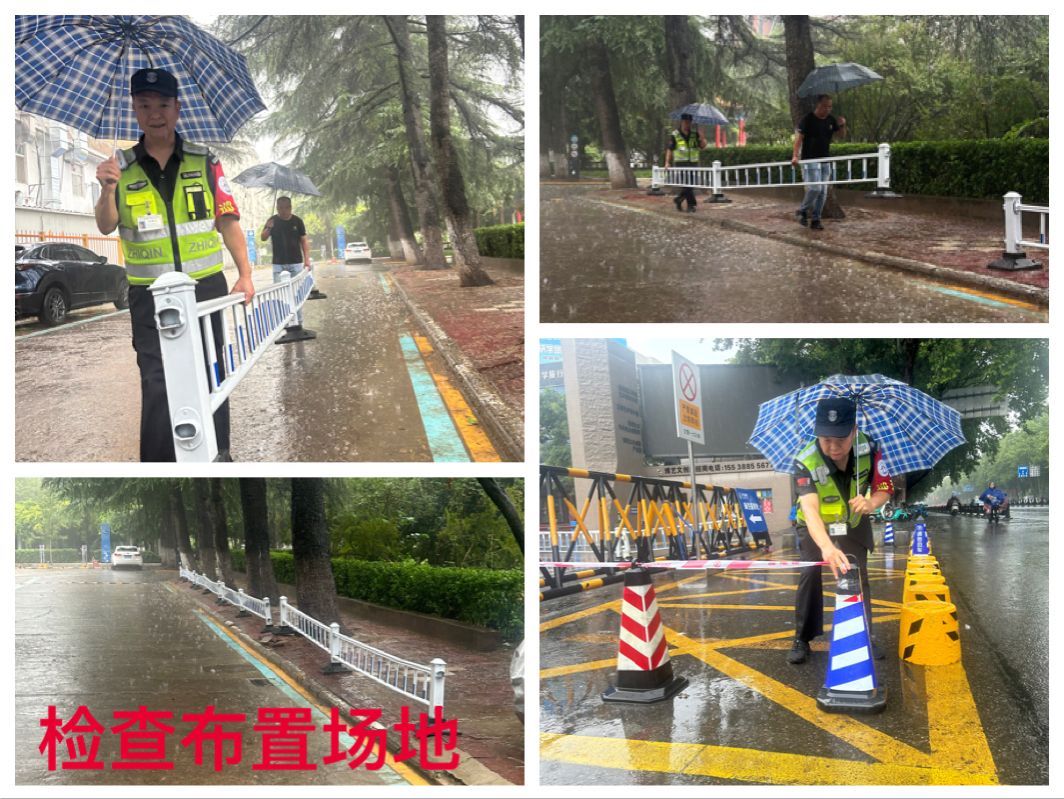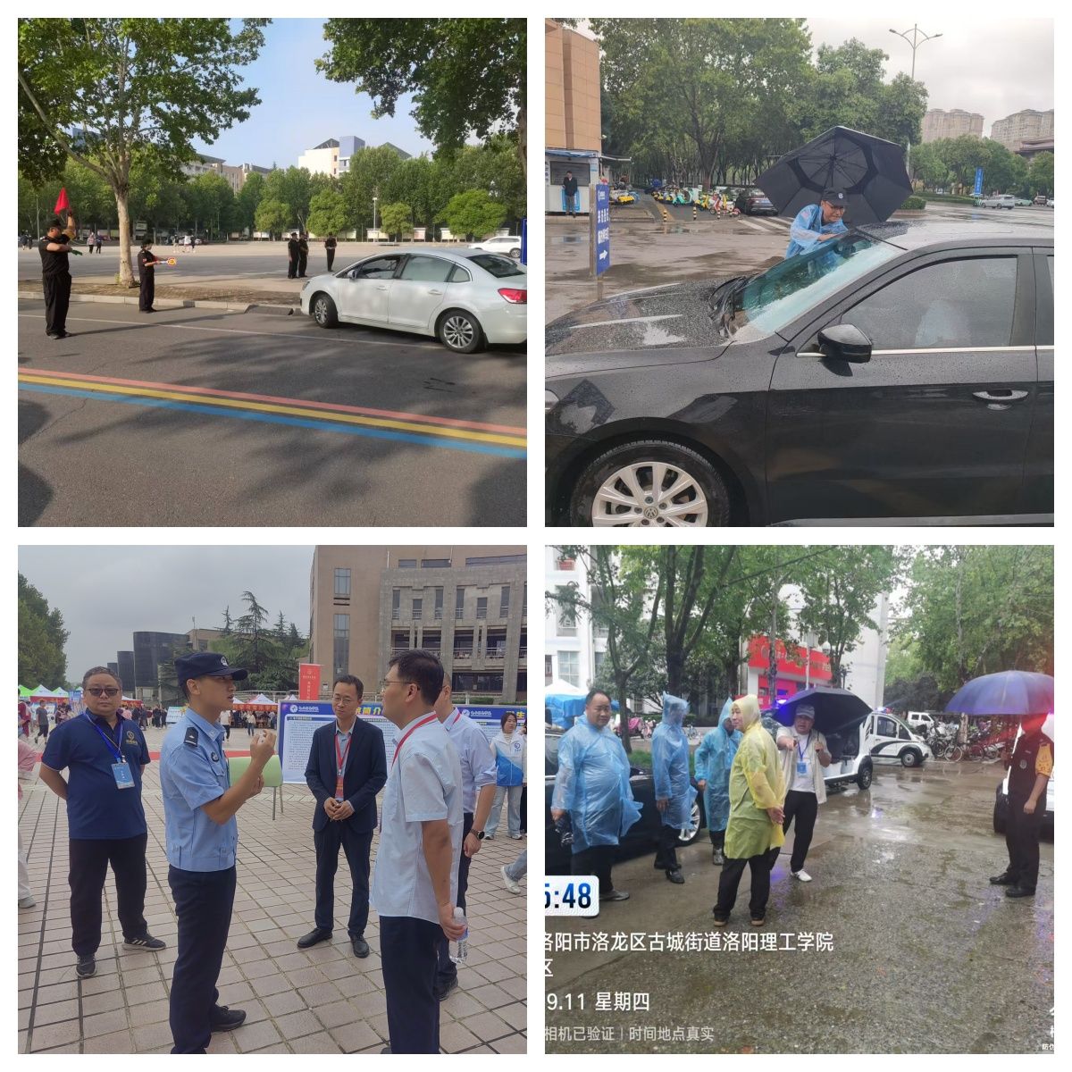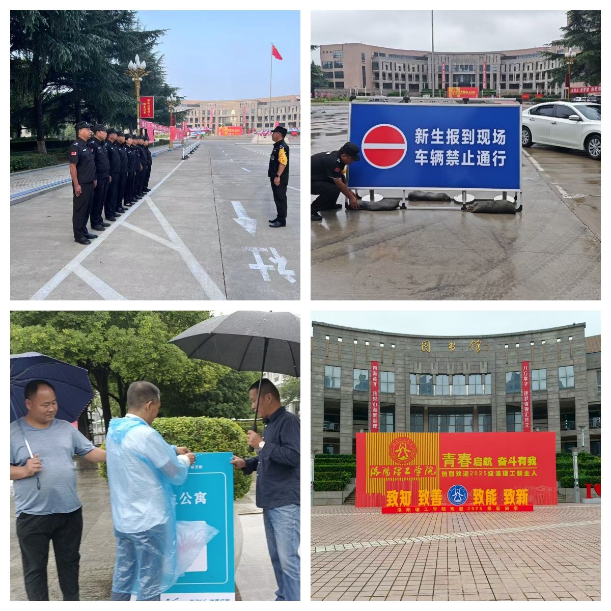 靠前指挥,保障校园秩序。新生人数多,又逢雨天,部分道路施工封闭,校园及周边交通压力大。保卫处绘制校园交通秩序图,标注行车方向与停车区,通过校园网和微信公众号提前发布。迎新当天,洛阳市交警增派警力疏导校外车流,保障周边道路畅通。校内政治保卫部全员上岗,增派安保人员,冒雨在关键点位疏导交通,指引新生及家长快速到达报到点,确保校园秩序平稳。