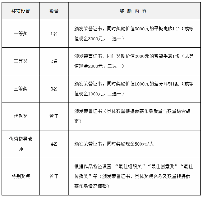 4.颁奖典礼与展览(11月27日):举办颁奖典礼,对获奖选手进行表彰,组织获奖作品展览并同步在有关公众号对获奖作品进行宣传展示,增强社会影响力。