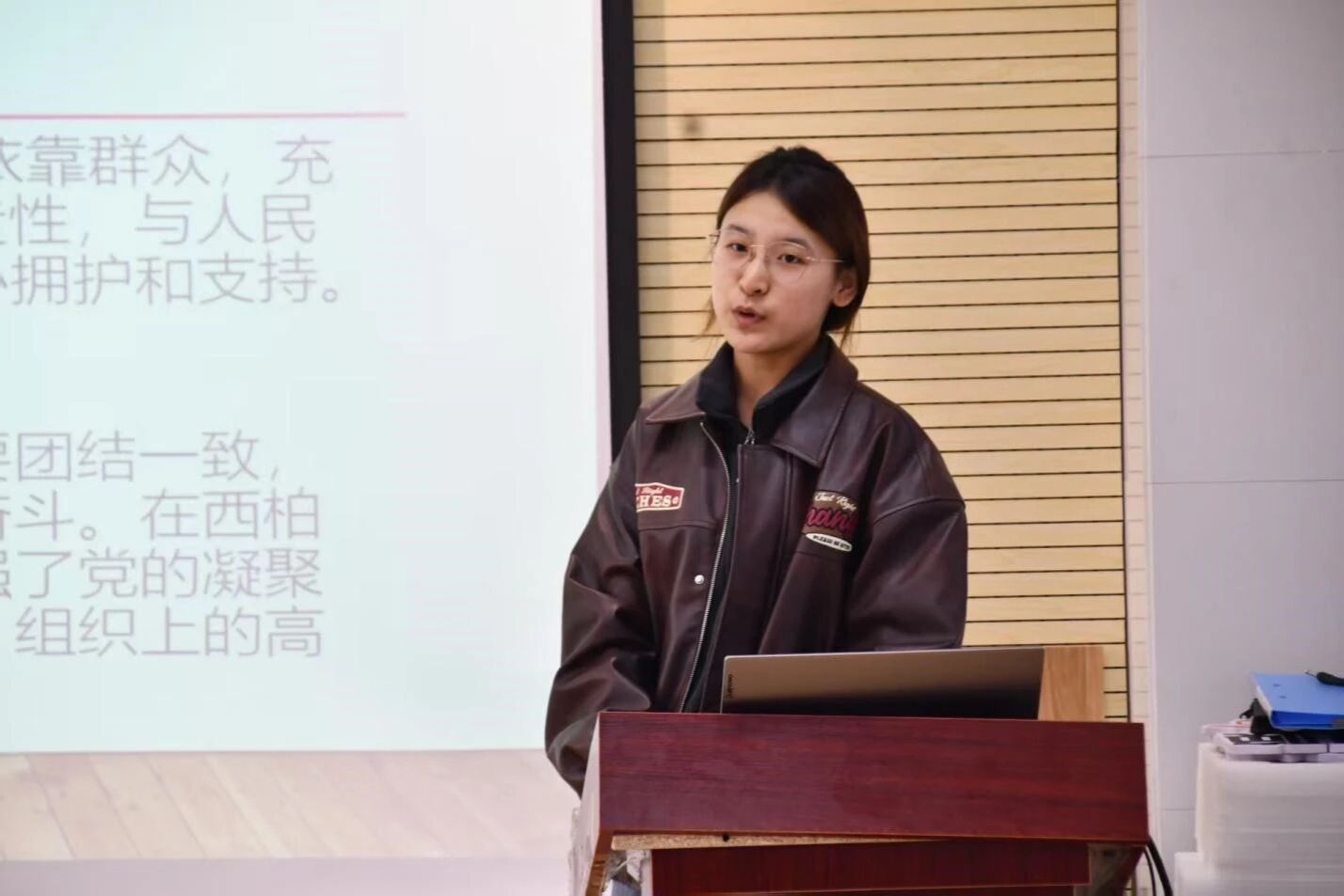 当日,轩睿同学主持“西柏坡精神”研讨会。她以中共中央进驻西柏坡的历史时刻为切入点,再现了党中央在“解放全中国的最后一个农村指挥所”运筹帷幄的光辉岁月,重点阐释了“务必保持谦虚谨慎、不骄不躁的作风,务必保持艰苦奋斗的作风”的核心要义。结合“进京赶考”的深刻警示,轩睿呼吁同学们以西柏坡精神为明镜,在成绩面前保持清醒,在挑战面前永葆奋斗姿态,砥砺前行不止步。