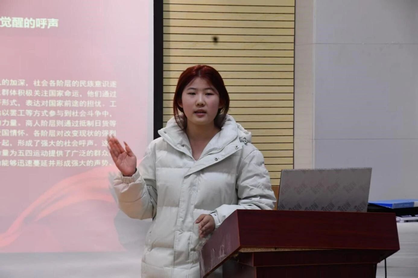同日,姬晓雨同学主持“五四精神”专题研讨会。她以赵家楼的烈火为引,回溯1919年青年学子“外争主权,内惩国贼”的热血壮举,深刻阐释了爱国、进步、民主、科学的五四精神核心。结合邓稼先、黄文秀等不同时代青年的奋斗故事,姬晓雨鼓励同学们将青春梦想融入民族复兴实践,在科研攻关、社会实践、文化传承中践行五四精神,用奋斗书写无愧于时代的青春华章。