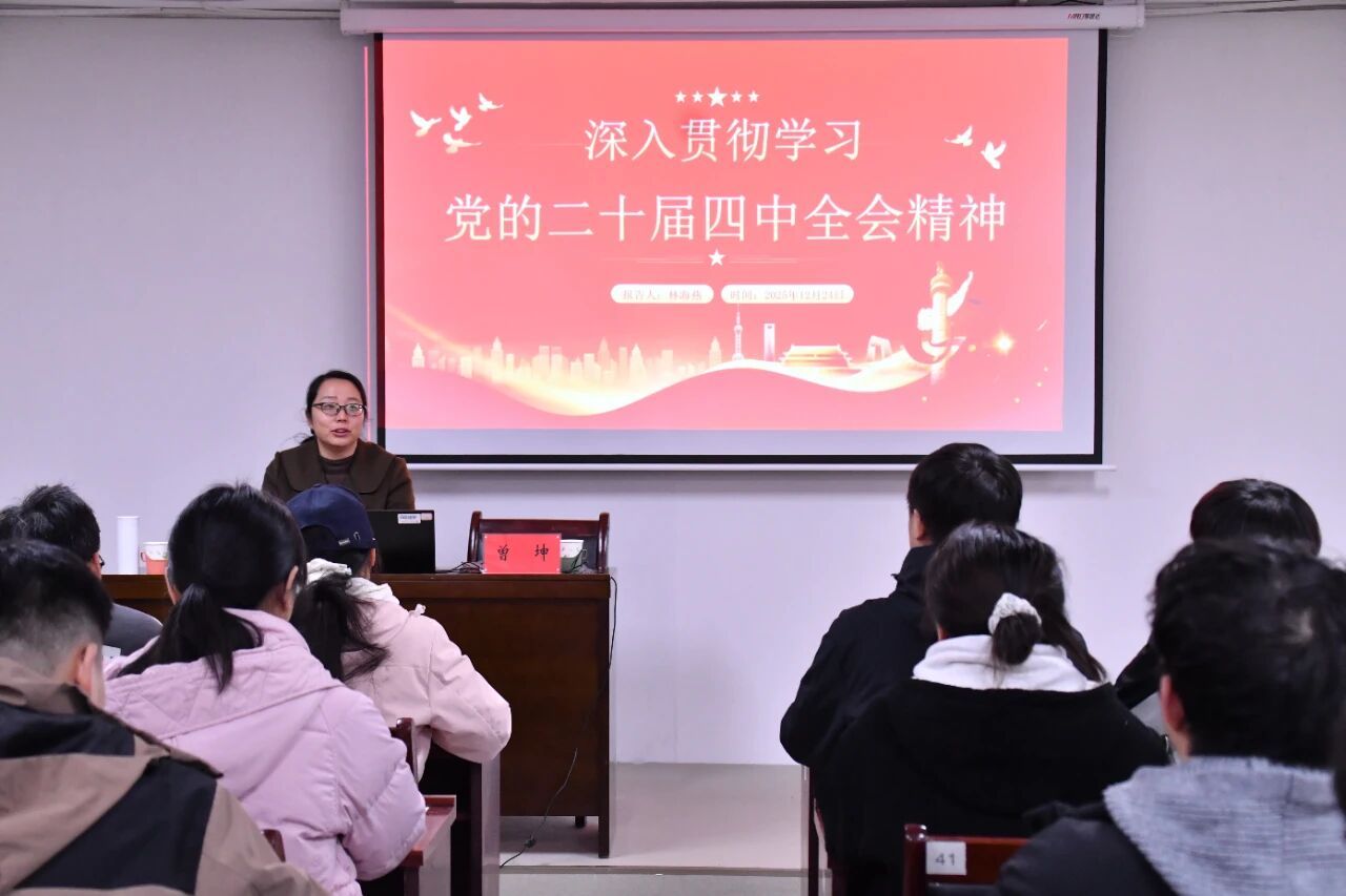 2025年12月24日下午,材料科学与工程学院在材料楼ES406会议室举行学习贯彻党的二十届四中全会精神宣讲会。学院党委书记林海燕担任主讲人,全体学生党员参加学习。宣讲会由学院专职组织员曾坤主持。