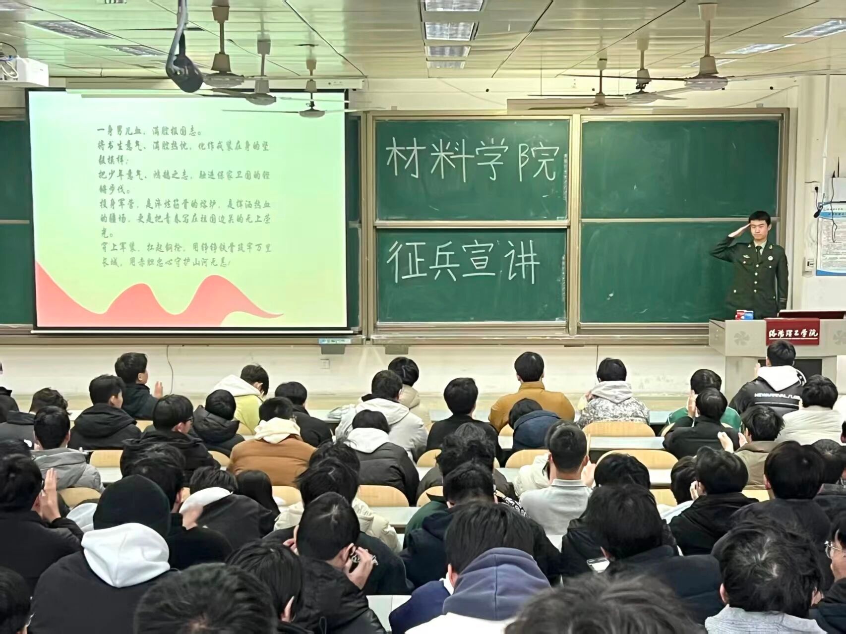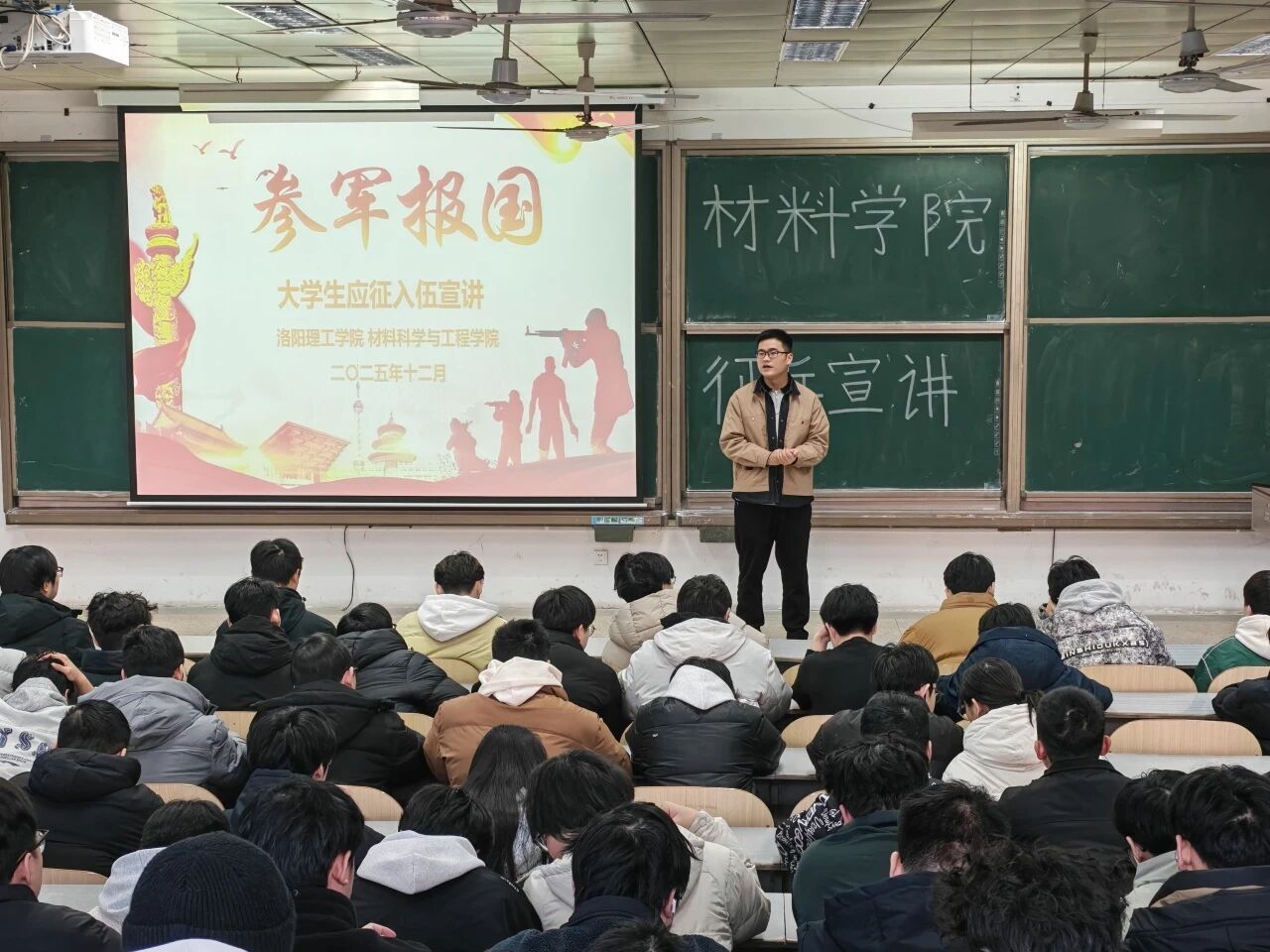 为激发大学生参军报国热情,鼓励青年学子投身国防建设,2025年12月25日,材料科学与工程学院在AE101教室举行2026年春季大学生应征入伍宣讲动员会。会议邀请2023级材料物理专业退役复学学生徐康硕担任主讲,学院2022级毕业班300余名学生参加。动员会由学院征兵联络员曾坤主持。