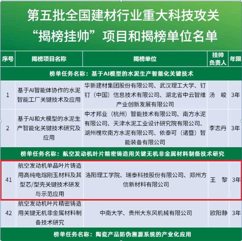 我校王黎教授团队牵头,联合瑞泰科技股份有限公司和郑州方信新材料有限公司共同申报的《航空发动机单晶叶片铸造用高纯电熔刚玉材料及其型芯/型壳关键技术研发与示范应用》项目成功获批并完成签约。该项目的签约标志着我校在服务国家重大战略需求、攻克高端新材料领域关键核心技术方面取得了重要进展,进一步提升了我校在建筑材料行业的知名度与影响力。