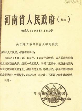 1982年11月初,洛阳市教育局与学校领导协商创办职业大学事宜,一致同意将职业大学设在洛阳市教育学院校址,一套机构两块牌子,并确定由学校尽快编写可行性报告报送教育部。1982年12月初,河南省教育厅领导赴北京向教育部递交河南省人民政府的保证书和《洛阳大学可行性报告》,教育部同意洛阳大学设在洛阳市教育学院。1983年8 月13日,河南省人民政府颁布《关于建立洛阳职业大学的批复》,同意建立洛阳职业大学,规模1500人,学制2 年~3年,根据当地国民经济发展需要设置专业,实行“自费走读、不包分配、毕业后择优推荐”的办学原则。