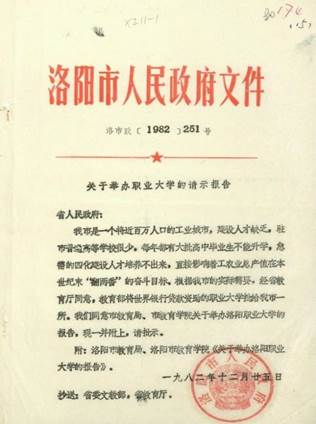 1981年11月,国务院批准将促进广播电视大学及短期职业大学发展列为我国第二批世界银行教育贷款计划项目。洛阳市政府以此为契机,及时地提出创办洛阳职业大学的设想。