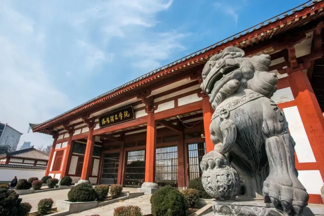 南门为仿汉风格建筑,典雅厚重。史载汉代太学即建于洛阳城南开阳门外,此门因而得名。校门采用典型的“新汉风”建筑风格,高台基,红柱身,粉墙灰瓦,重檐四阿屋顶。中间开阔,两厢紧凑的五开间布局舒展大气。墙壁东西两侧,除雕刻传统的苍龙、白虎、朱雀、玄武“四灵”图案外,更添加了四位与洛阳渊源深厚的古代先贤——编撰《说文解字》的许慎、发明造纸术的蔡伦、制造地动仪的张衡和撰写《史记》的司马迁,人文意蕴浓厚。在现代建筑群中,南门以其独特的历史气质,成为洛阳理工学院文化底蕴的鲜明标识。