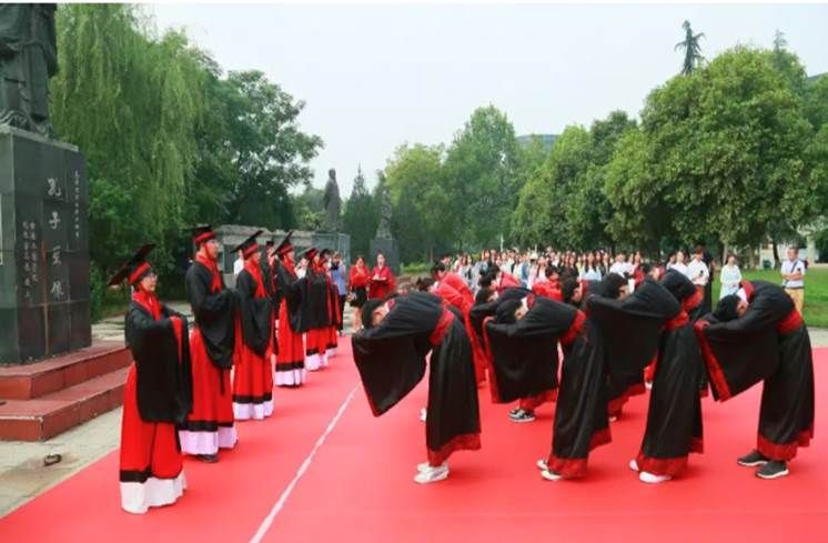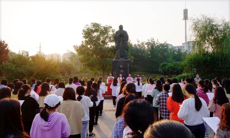 孔子像体态微向前倾,双手交叠,神情肃穆而温和,展现出一代圣哲谦恭雍容的气度,默默守护着校园中勤学不辍的学子。学校也常在圣像前举办束脩礼、经典诵读等文化活动,在仪式中传承师道,在书香中弘扬传统。