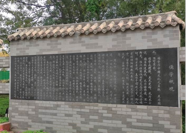 《儒学概观》开篇即言:“儒学乃中国文化之主脉,是为国人,不可不察。”墙背以仿汉画像砖雕手法,刻有“入周问礼”“孟母三迁”“孔融让梨”“程门立雪”四则经典故事。