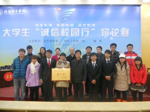 在本次辩论赛中,我系荣获院级冠军,院团委宣传部部长张宽亮为我系辩手颁奖。另外,张老师指出了辩论赛的共同不足之处:没有抓住对方的观点为自己所用。