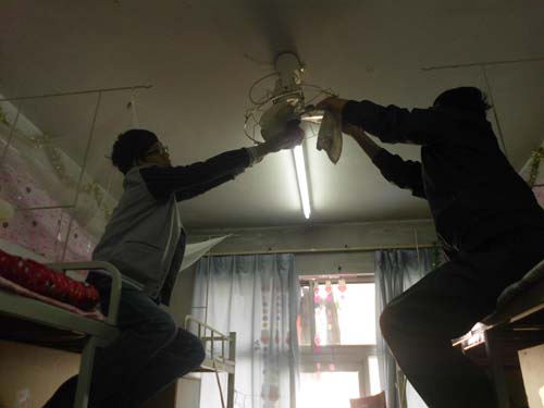 2014年3月19日,我系青联和宿管部利用午休时间组织部分学生来到女生宿舍,对女生宿舍房顶的悬挂式风扇进行清理、维护。 活动最后,宿管部同学还对女生宿舍的卫生进行了检查。