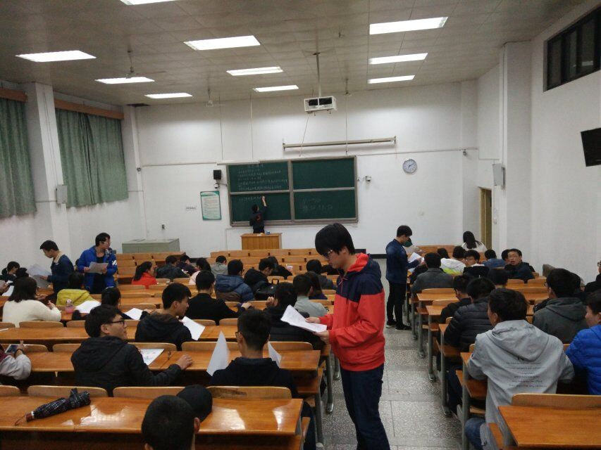 参赛同学按照安排的座位坐好后,权益委员会干事开始为参赛同学分发试卷。同学们拿到试卷后,开始认真答题,分秒必争。权益委员会干事负责维持考场秩序。随着考生们陆续交卷离开考场,考试接近了尾声。