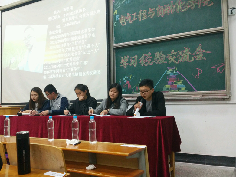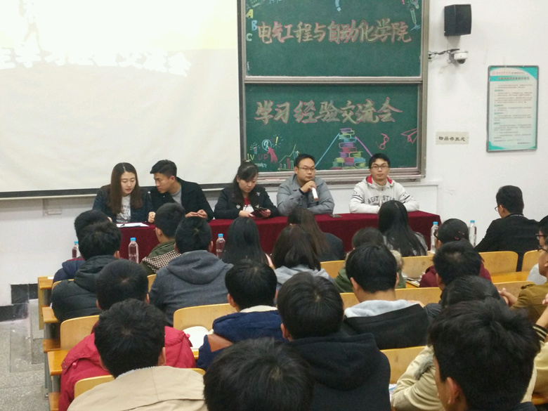 11月16日晚,电气工程与自动化学院在D1教室召开了学习经验交流会。电气工程与自动化学院团委副书记张斐然和学工办主任张垓老师出席了此次大会。院学生会主席、团委副书记、常务副主席、宣传部部长、14、15级优秀学生代表及大一、大二学生共一百余人参加了此次大会。