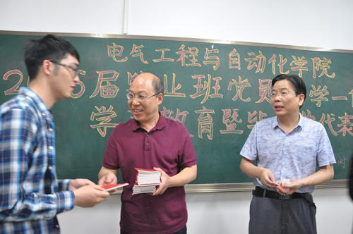 高进旗副书记对毕业生中的党员代表传达了学校关于“两学一做”教育学习的精神,希望毕业生党员在离校前,发挥党员模范带头作用,时刻铭记自己党员身份,响应学校 “心怀感恩、情系母校、筑梦祖国”的号召,以身作则,站好最后一班岗,协助辅导员老师做好各项工作,确保全体毕业生安全、文明、有效离校,争当文明离校毕业生。
