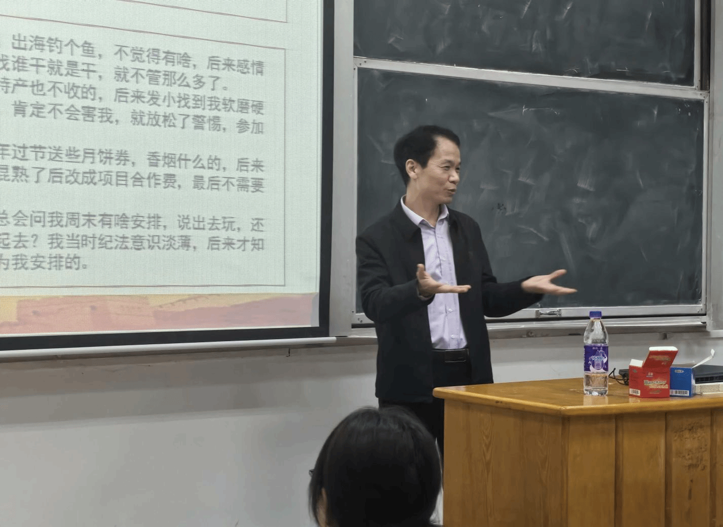 课堂上,水付新老师通过剖析王雪、张雨杰等年轻干部失守底线、贪图私欲的案例,揭示丧失清正廉洁对个人前途和社会秩序的严重危害,强调廉洁是青年成长的“生命线”,必须夯实拒腐防变的思想根基,锤炼忠诚品格。