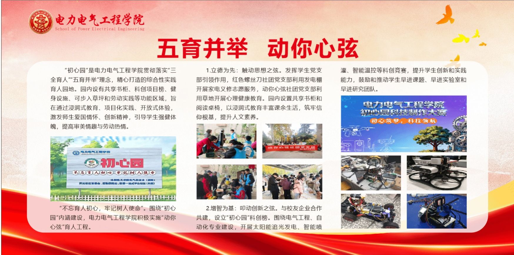 为深入落实立德树人根本任务,电力电气工程学院贯彻落实“五育并举”教育理念,以“筑牢信念之塔,点亮报国初心”为核心理念,着力打造“铁塔初心”党建品牌,全面加强党的基层组织建设,为引领各项事业高质量发展提供了有力支撑。学院党委创新推动“初心园”育人平台建设,通过实施“五育并举 动你心弦”育人工程,在思想引领、科技创新、劳动实践等方面开展生动实践,初步构建了以高质量党建引领的多元化育人体系。