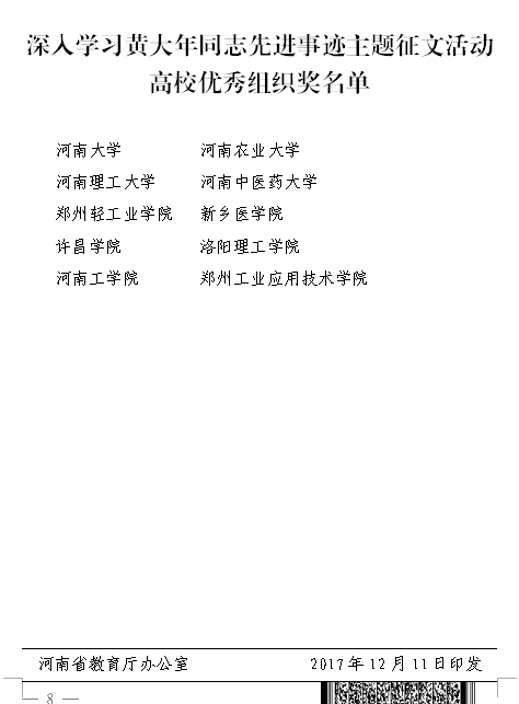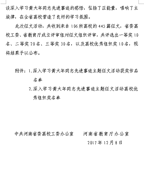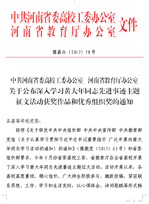 为认真贯彻落实习近平总书记重要指示精神,深入学习宣传黄大年同志先进事迹,按照省委高校工委工作部署,9月26日-10月10日,我校在全校师生中认真组织开展了深入学习黄大年同志先进事迹主题征文活动。近日,省委高校工委办公室、省教育厅办公室发文《关于公布深入学习黄大年同志先进事迹主题征文活动获奖作品和优秀组织奖的通知》(豫高办〔2017〕78号),我校获得主题征文活动高校优秀组织奖。