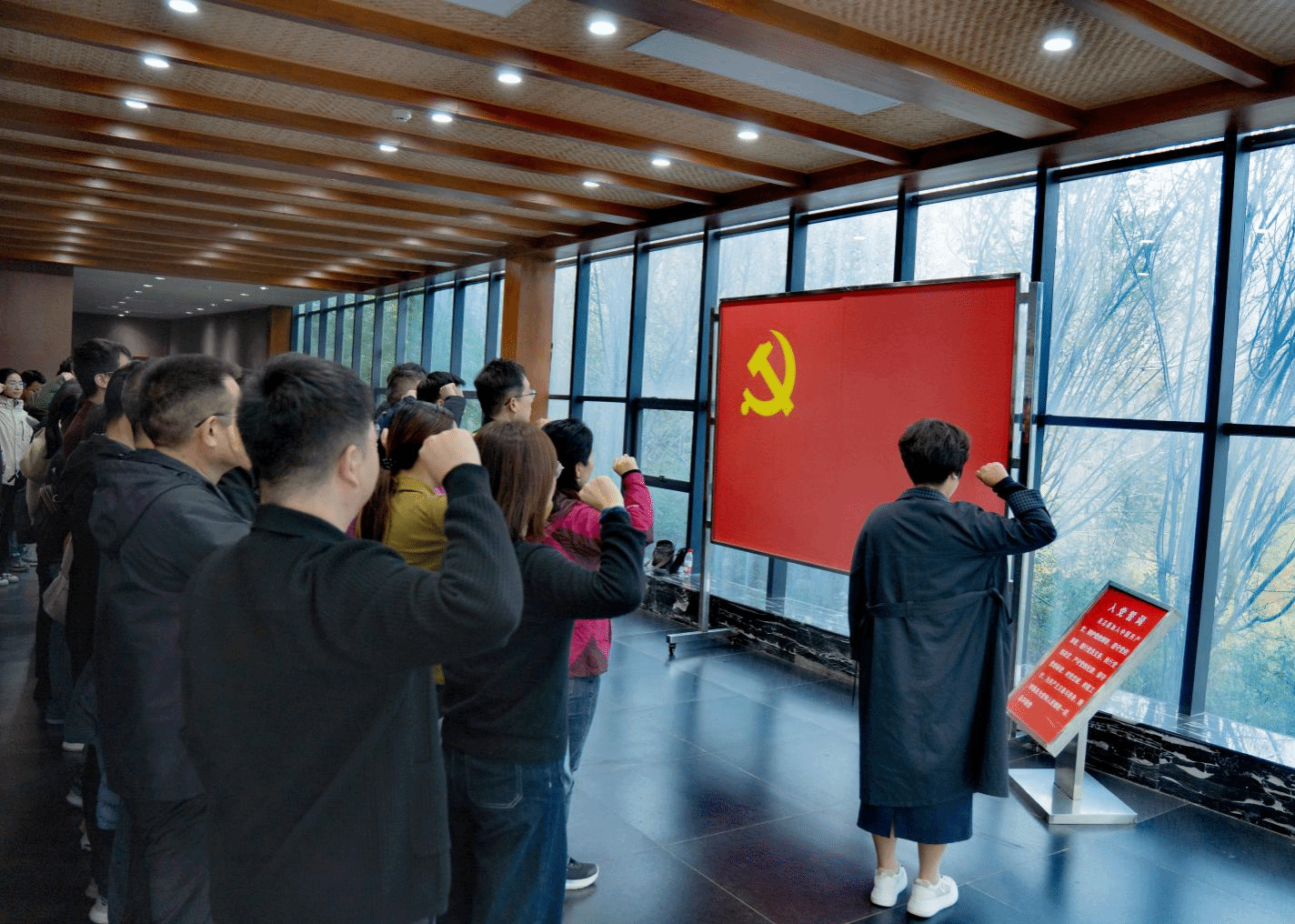 全体党员在基地宣誓大厅重温入党誓词。面对鲜红的党旗,大家高举右拳,庄严宣誓,铮铮誓言回荡在山间,不仅是对入党初心的再次叩问,更是对传承愚公精神、践行育人使命的郑重承诺。