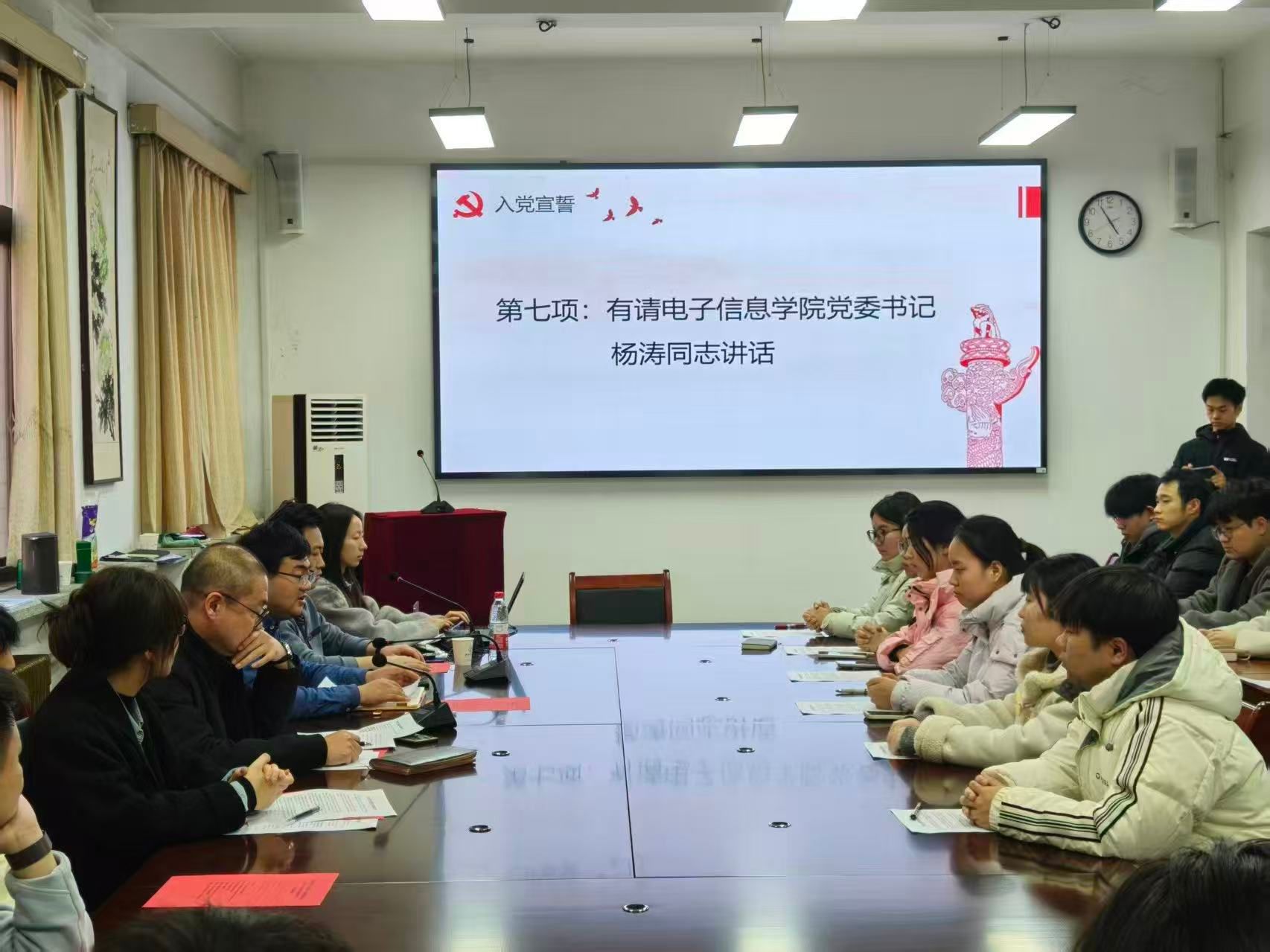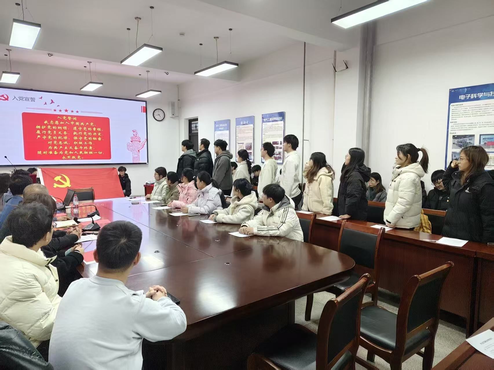 2026年1月6日下午16:30,电子信息学院在实验楼D210隆重举行2025年下半年新发展预备党员入党宣誓仪式。学院党委书记杨涛、党委副书记陈朝辉,各党支部书记、支部委员,全体学生党员以及本学期新发展的16名预备党员共同参加了这一庄严而充满意义的政治仪式。仪式由崔云鸽老师主持。