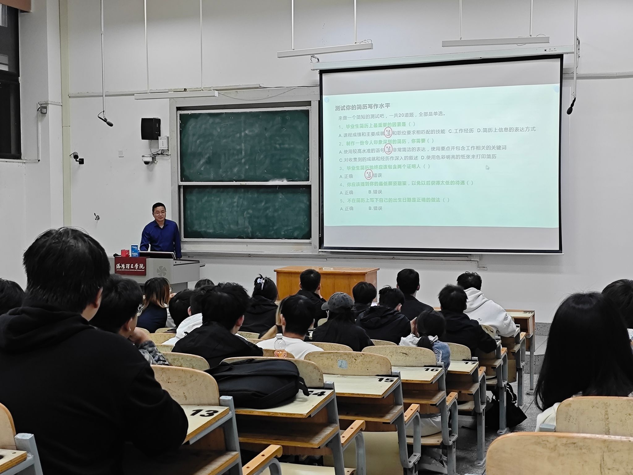 会议伊始,田老师便将重点聚焦于简历的结构搭建,通过系统讲解个人信息、教育背景、实践经历等核心模块的科学排序逻辑,引导同学们学会在简历有限的篇幅内,精准突出自身核心优势,让简历重点更鲜明、更具吸引力。同时,田老师还特别强调,优质简历是高效展现个人竞争力的关键载体,制作时需围绕教育背景、实践经验与技能特长三大核心维度进行重点呈现,确保简历能清晰传递个人核心价值。