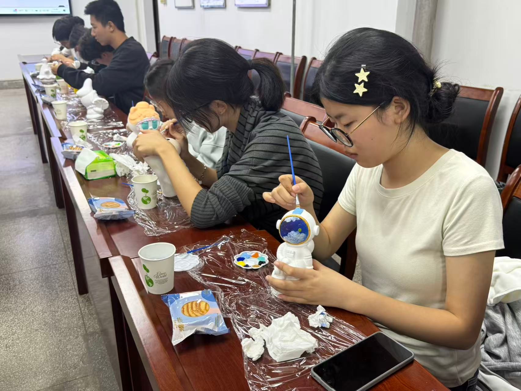 学院为师生们准备了各式口味的月饼,活动伊始,董红政首先向所有留校学子致以节日的诚挚问候,表示学院始终是同学们的坚强后盾和温暖家园,希望这场彩绘活动能让大家感受到家的温暖,缓解思乡之情。赵文婷以通俗易懂的方式讲解了色彩搭配技巧、简单图案设计及绘画技巧。在创作过程中,同学们充分发挥自己的想象力与创造力,挑选心仪的石膏娃娃造型,调配喜欢的颜色,用笔尖蘸取颜料,在素白的石膏上勾勒线条、填充色彩、描绘图案,从懵懂摸索到渐入佳境,一个个原本平淡的石膏娃娃逐渐被赋予了鲜明的个性与独特的美感。