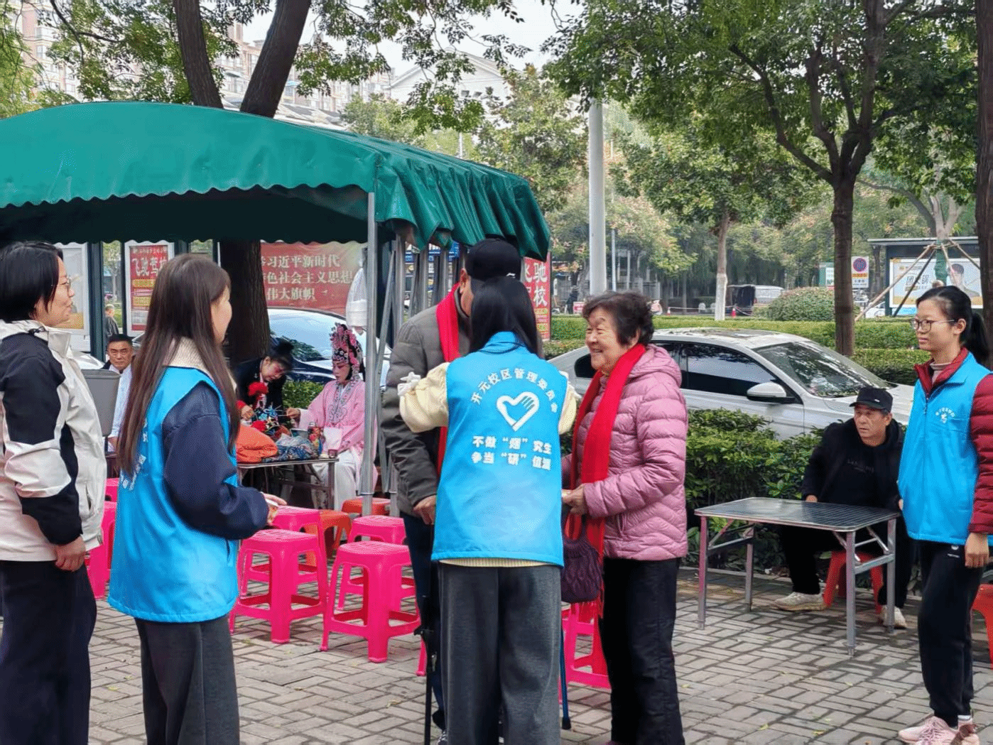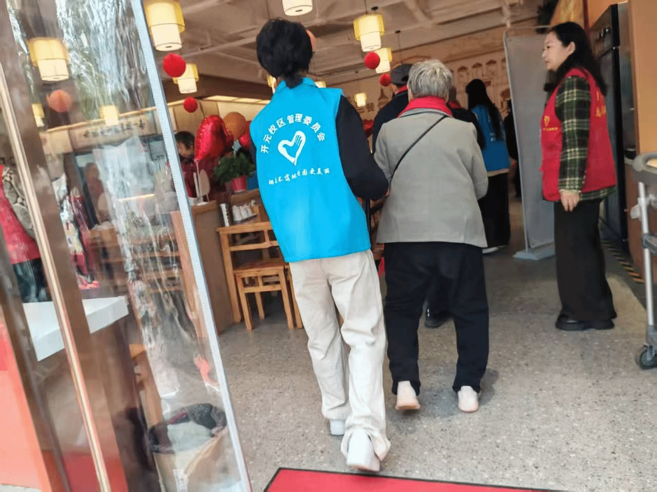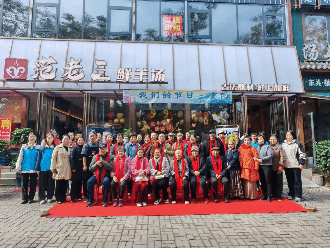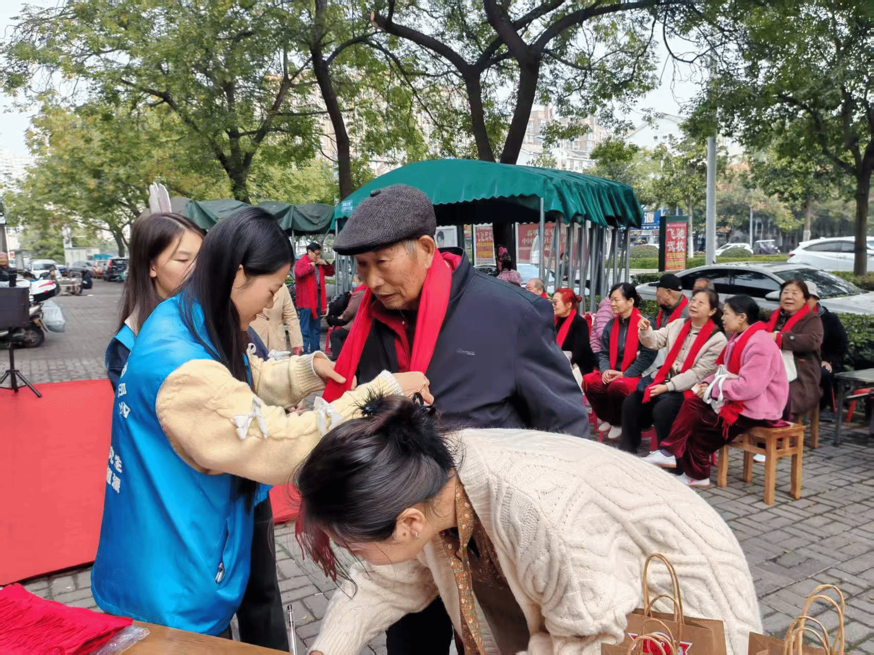 活动现场处处涌动着温情暖流。志愿者为老人佩戴上象征温暖与祝福的红围巾,并全程贴心陪伴:主动搬椅子、搀扶行动不便的老人入座,细致地为老人盛汤、递上主食,耐心倾听他们的汤味回忆,用青春活力为老人们带去欢乐。活动尾声,志愿者与老人们并肩而立,在汤香氤氲的背景下合影留念,镜头定格下一张张洋溢着幸福的笑脸。