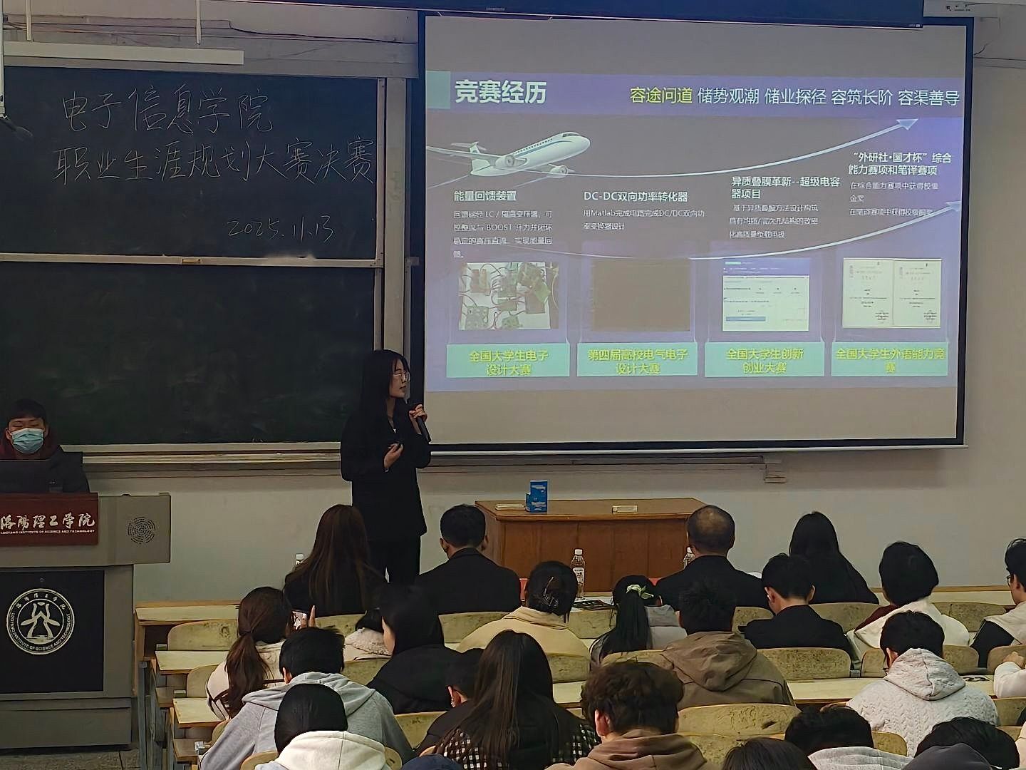 本次职业规划大赛分为成长赛道和就业赛道,经学院就业办公室预赛筛选共有十名选手入围决赛参赛。选手们来自不同年级和专业,在决赛现场,他们通过PPT生动展示了独具特色的职业规划方案和详细实施计划,以自信从容的演讲和精美直观的幻灯片,充分展现了电子信息学院学生的青春风采与专业素养。