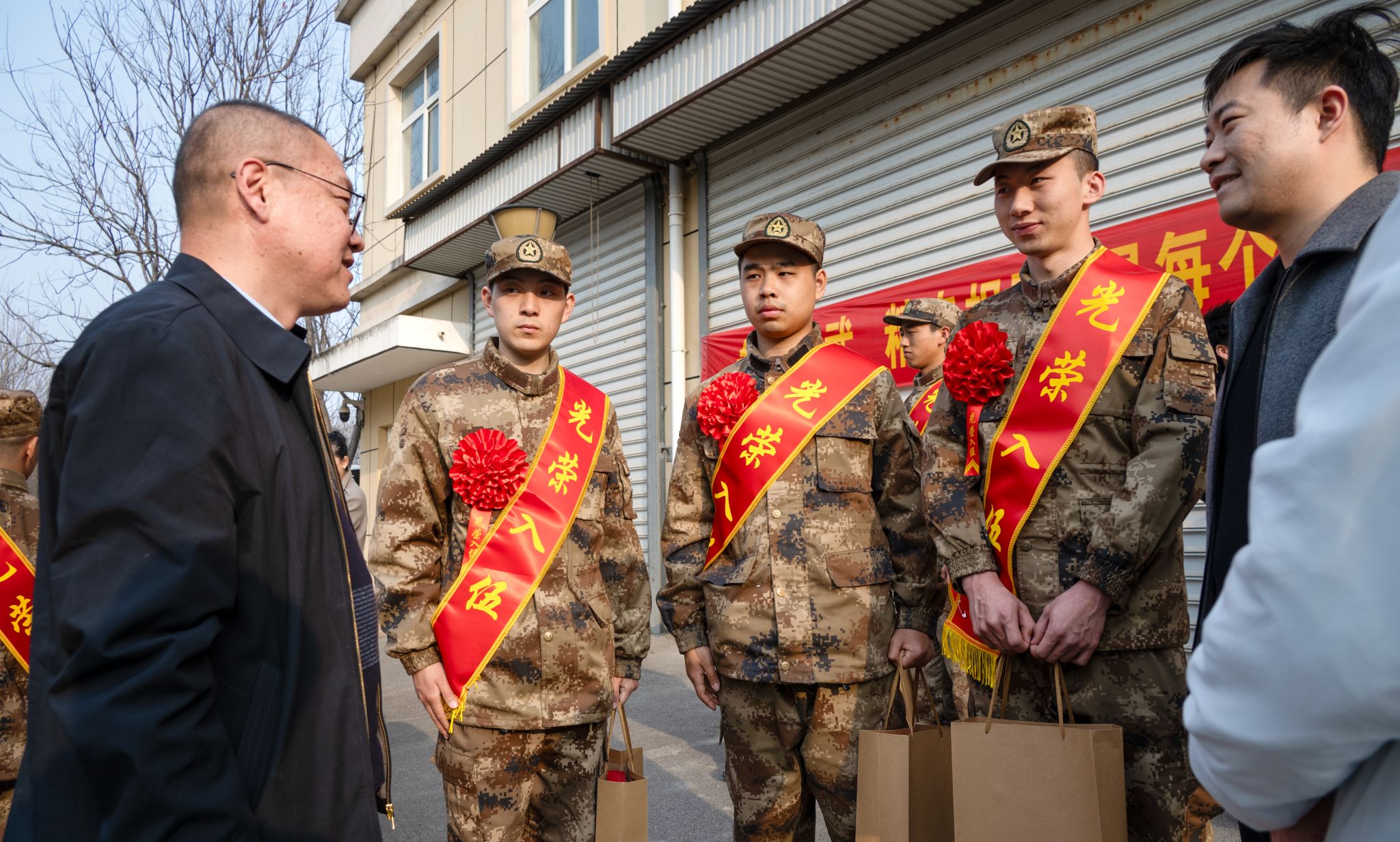 仪式现场,学院为三名参军入伍学生送上精心准备的礼品,一份份礼品承载着学院对学子们的殷切关怀与美好期许,让即将踏上军旅征程的同学们倍感温暖。陈朝辉代表学院向三名同学携笔从戎、立志报国的青春选择给予高度肯定,勉励他们在部队中锤炼意志、刻苦训练。叮嘱三名学子不忘专业所长,将课堂所学的专业知识与军营建设实践相结合,充分发挥专业优势,在部队的岗位上履职尽责、发光发热,以专业能力践行报国初心。并表示学院将全力做好学业、生活等各项服务保障,成为学子们坚实的后盾。