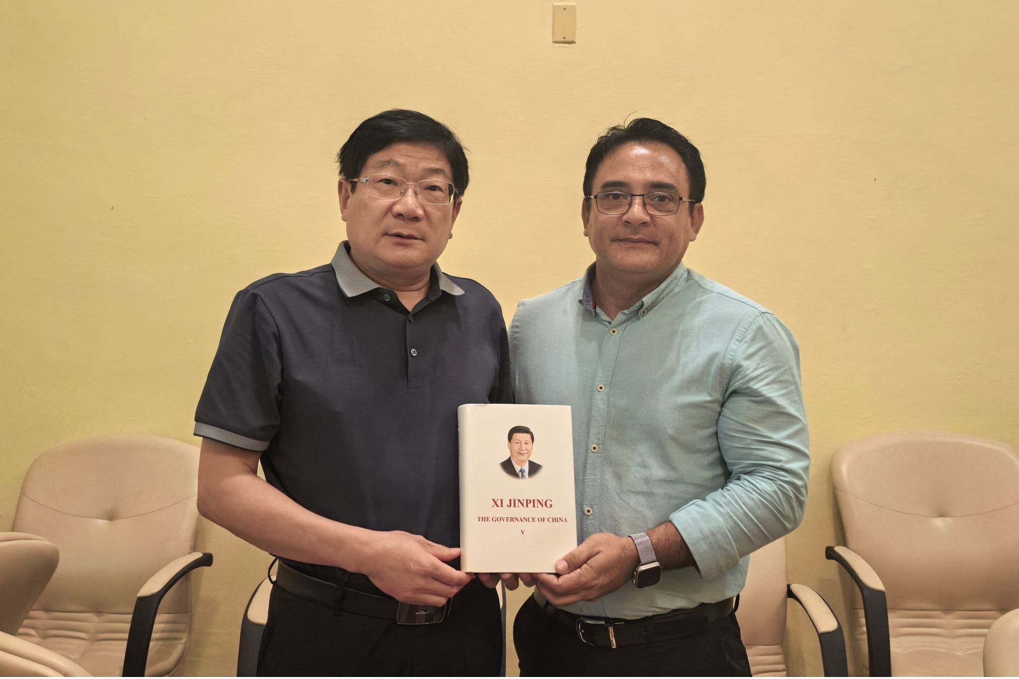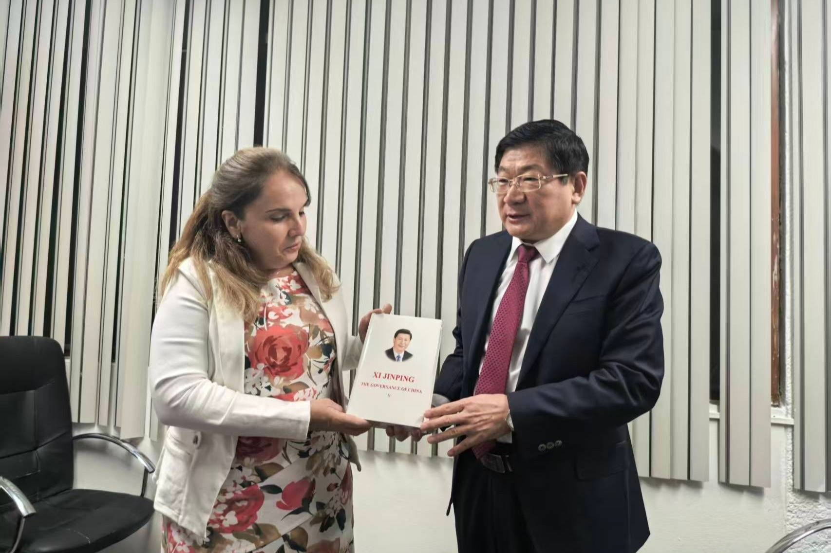 卢志文向古巴哈瓦那大学高等教育研究中心主任Amaurys赠送《习近平谈治国理政》第五卷英文版