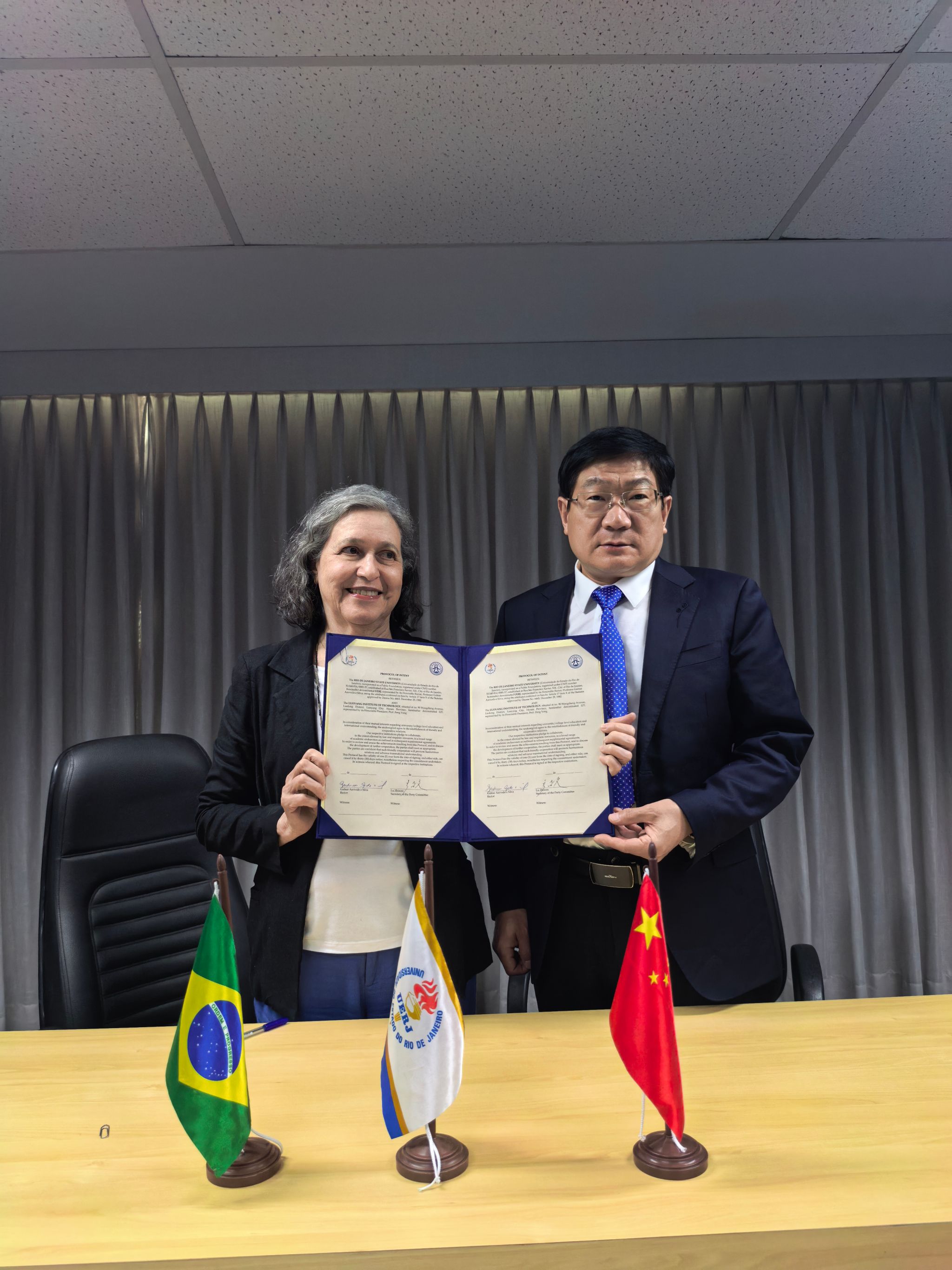 在巴西里约热内卢州立大学期间,卢志文对巴西高校的热情友好接待表示衷心感谢,代表团与里约热内卢州立大学校长Gulnar Azevedo e Silva等进行座谈交流。里约热内卢州立大学在公共卫生、智能制造及新能源领域研究突出。该校与我校就共建“食品发酵与生物技术联合实验室”达成了一致意见。在与会人员的共同见证下,卢志文代表学校签署合作框架协议,并期望双方开展更多联合研究与学术交流活动,以进一步促进中巴两国间的紧密关系。