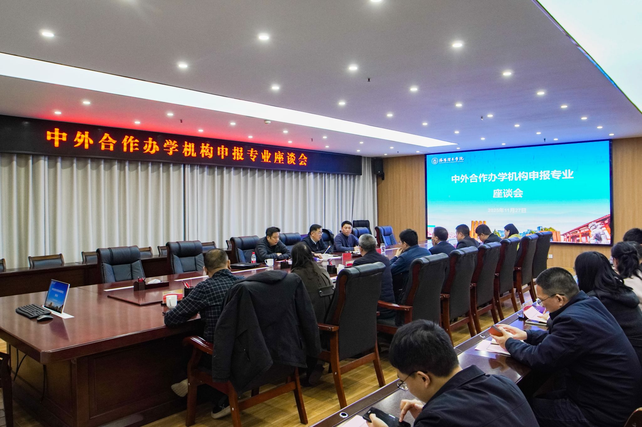 11月27日,我校在王城校区行政楼116会议室召开中外合作办学机构申报专业座谈会。学校党委副书记胡恩立、国际交流合作处、智能制造学院、电力电气工程学院等相关学院党政主要负责人、分管外事工作负责人和外事秘书参会,会议由国际交流合作处处长胡富茂主持。