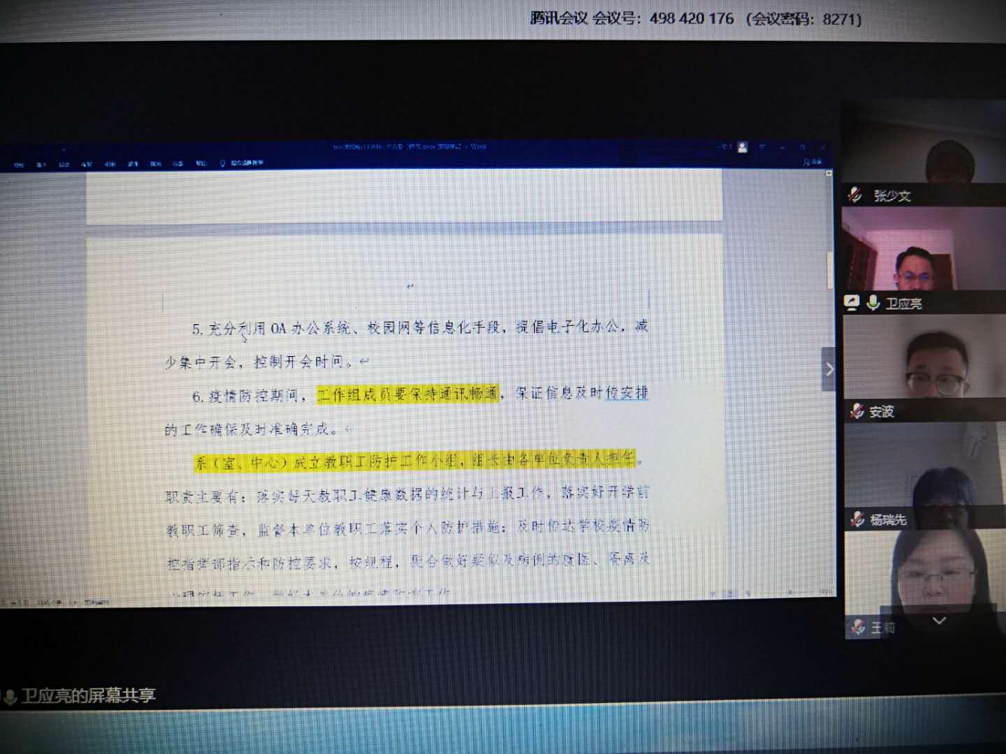 最后,我院院长张少文总结,我校疫情防控总目标 “不能在校园内出现集聚性爆发”、“不能出现重大舆情事件”既是学院每个人的工作目标,又是学院的教学保障。全体教职工一定要做到疫情防控和教学科研两手抓、两不误,做好师生疫情信息摸排上报工作的同时,也要创新教学方法和模式,注意课程建设的高阶性和挑战度,不断提高线上教学的课堂质量,保质保量完成各项教学任务,更要做到保持定力、慎终如始,持续推进疫情防控和学院其他工作,务求“十三五”建设完美收官!(文、图/李月,编辑/李月,审核/王莉、张少文)