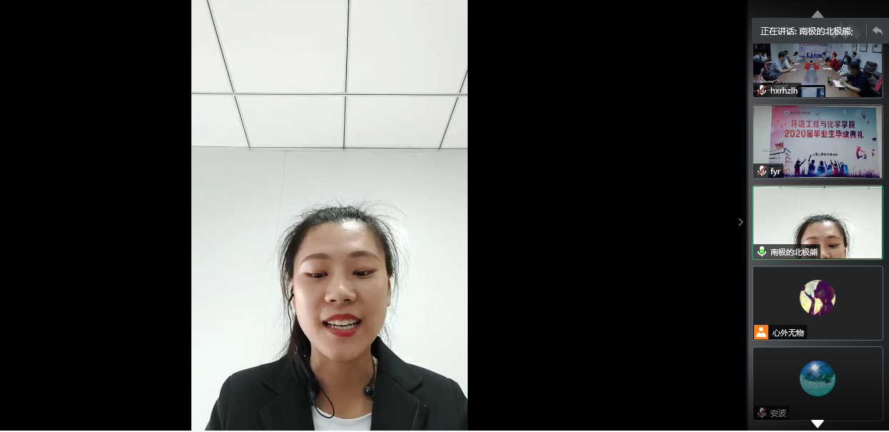 这是在特殊时期举办的一场特殊的毕业典礼。2020年6月5日下午,我院在环化楼DN303会议室,以全程直播的形式举办2020届毕业生线上“云”毕业典礼,学院党委书记王莉、院长张少文、副书记安波、副院长卫应亮、各系室主任、学工办主任、团委书记、毕业班辅导员以及四名2020届毕业生代表现场出席典礼,近300名毕业生参加线上典礼仪式。典礼由党委副书记安波主持。