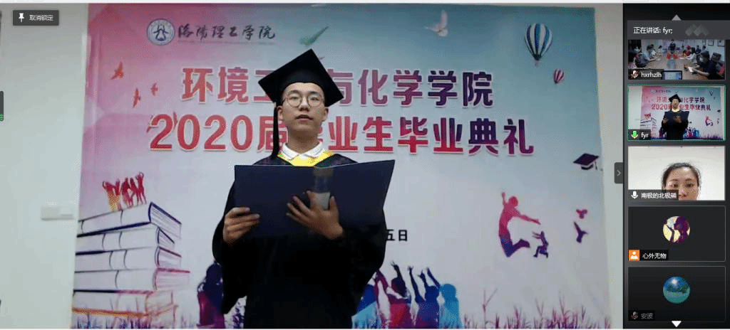 毕业生代表环境工程专业白俞何同学发言,他回顾了大学期间的点点滴滴,表达了对未来的无限憧憬和对母校的留恋和感激之情。