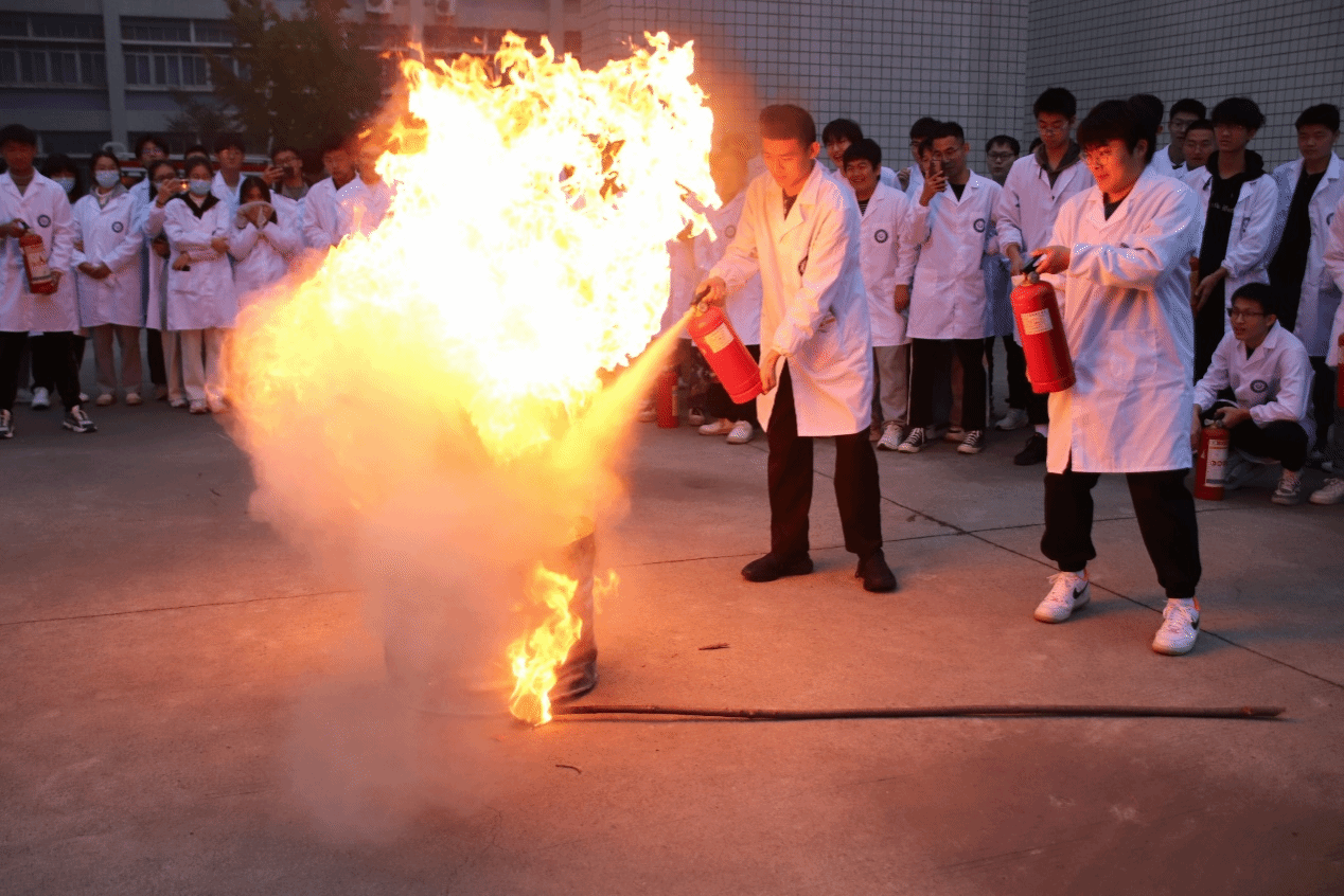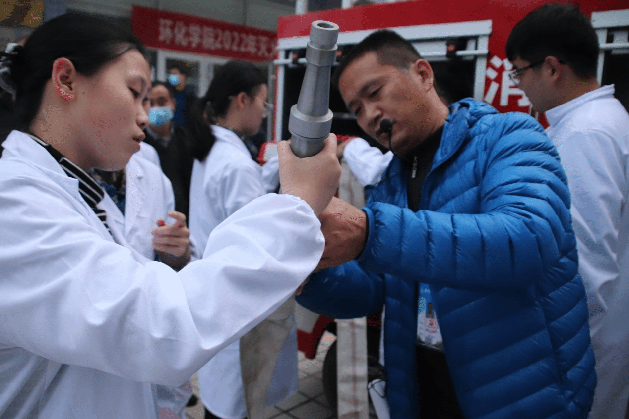 保卫处消防科姚树尚老师向全体师生普及了防范火灾常识,详细地介绍了各种类型的灭火器的使用方法及注意事项,带领学生们使用灭火器进行实际的灭火操作和消防水枪灭火演练。