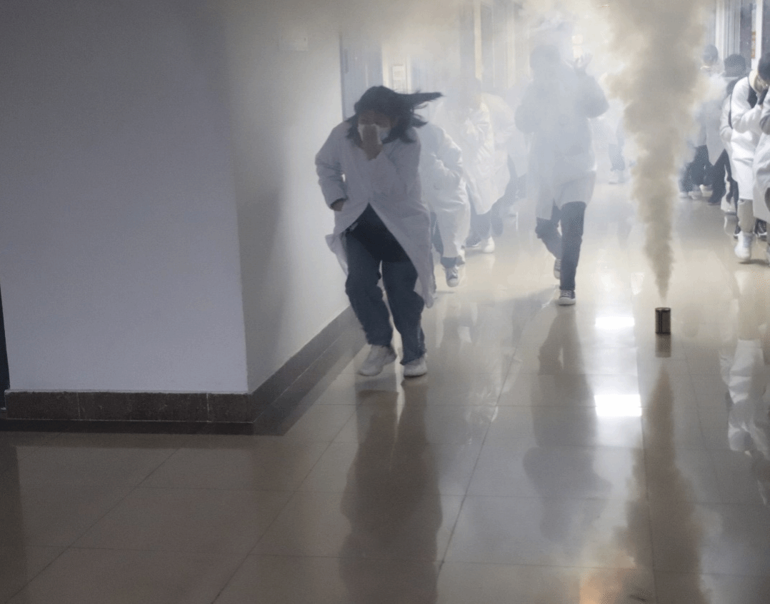 随着指挥员一声哨响,预想事发地烟雾缭绕,全体人员进入紧急状态并分队列、弯腰、捂鼻有序撤离!