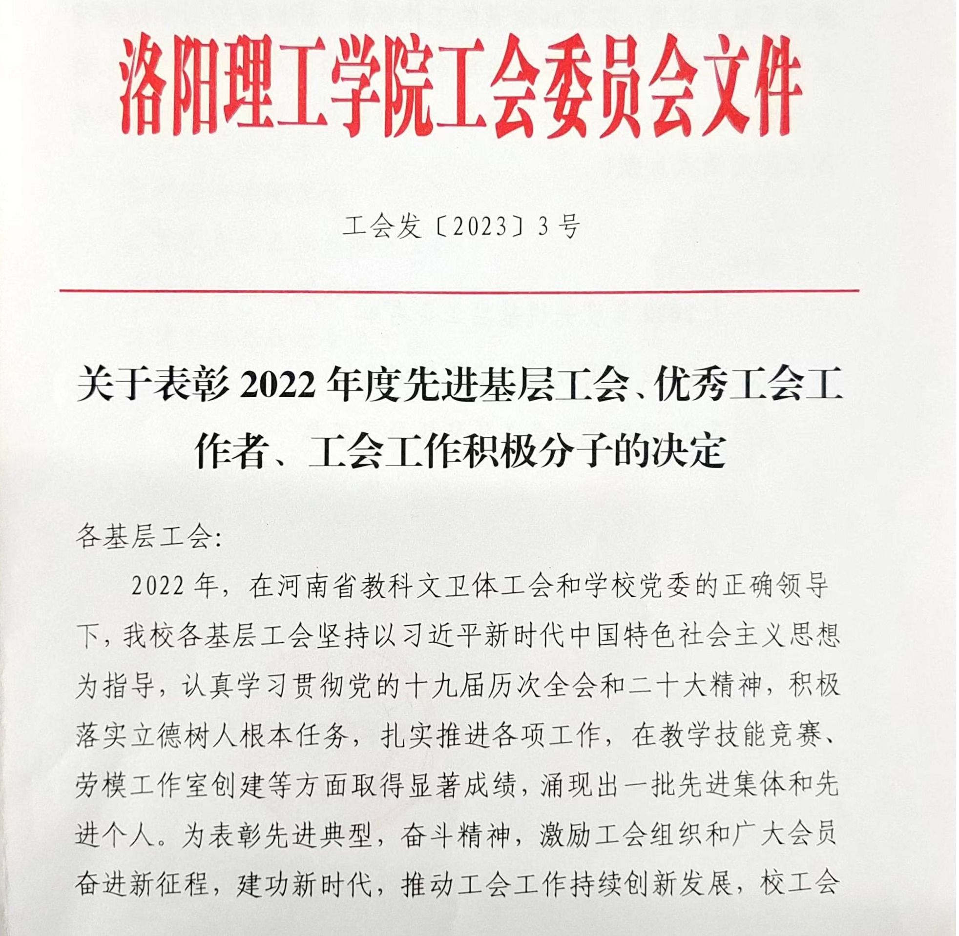 3月24日学校在王城校区办公楼116会议室召开2023年度工会工作会议,我院分工会获得“先进基层工会”荣誉称号,我院教师王雅君、许艳杰、任平、王银霞获“巾帼建功标兵”称号,教师何玉远、张琳获“工会工作积极分子”称号,教师何嵘获“优秀工会工作者”称号,教师贾晓慧获“先进文体协会工作者”称号。