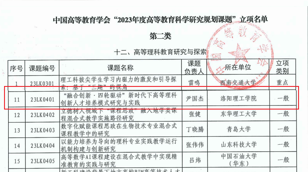近日,中国高等教育学会公布了2023年度高等教育科学研究规划课题立项名单,我院尹国杰副院长团队申报的《“融合创新·四轮联动”新时代下高等理科创新人才培养模式研究与实践》成功获批,是我院首次获批此类项目。