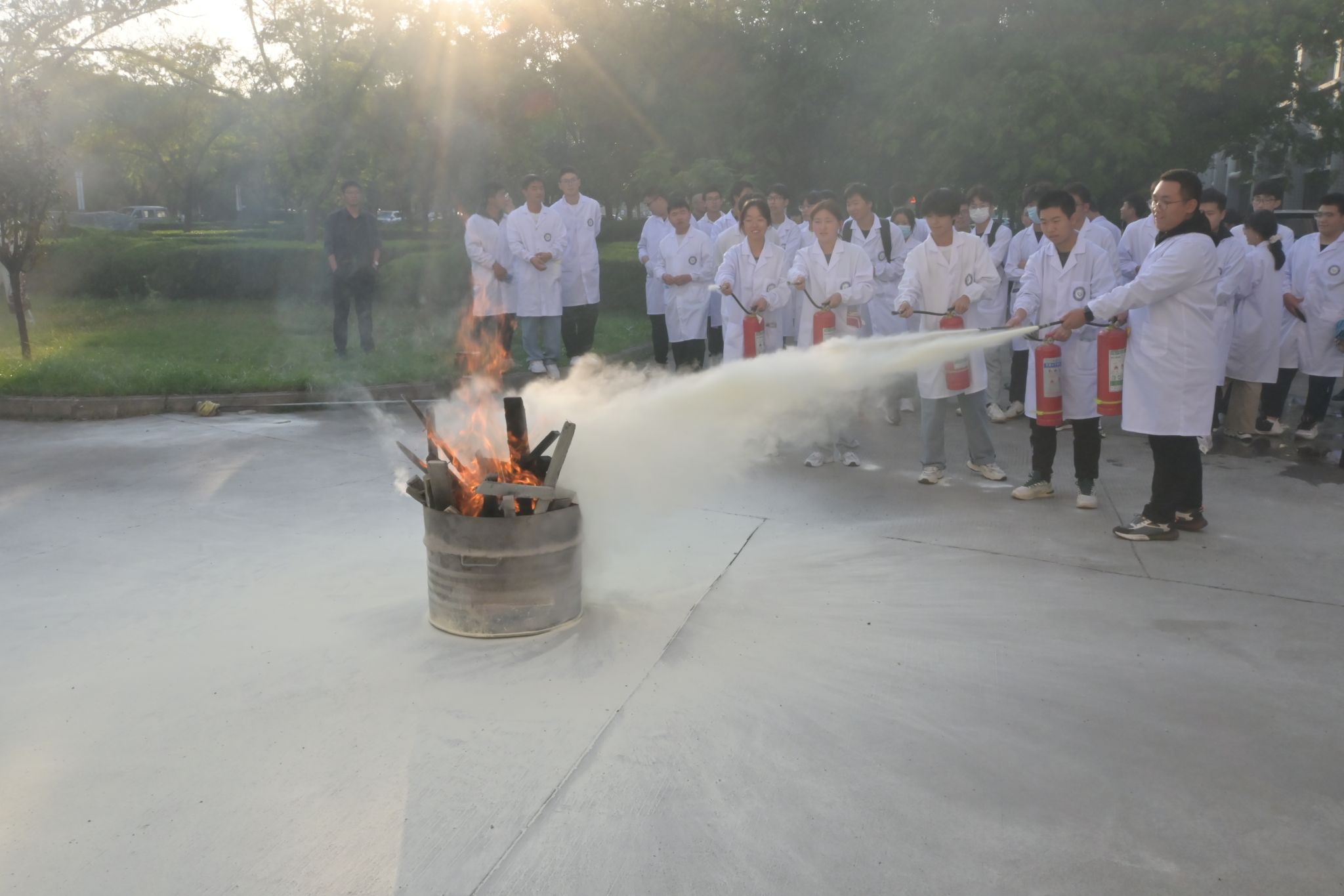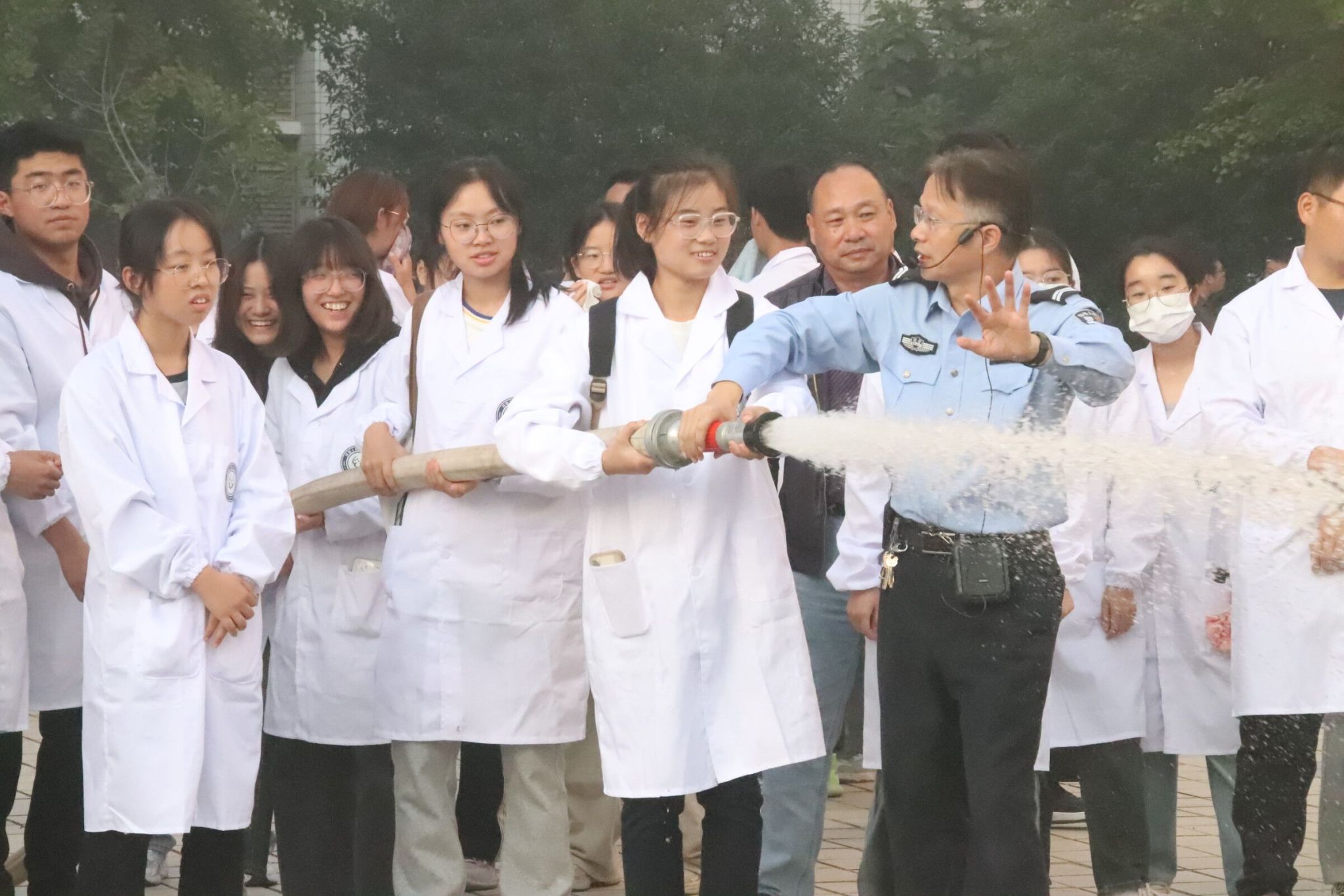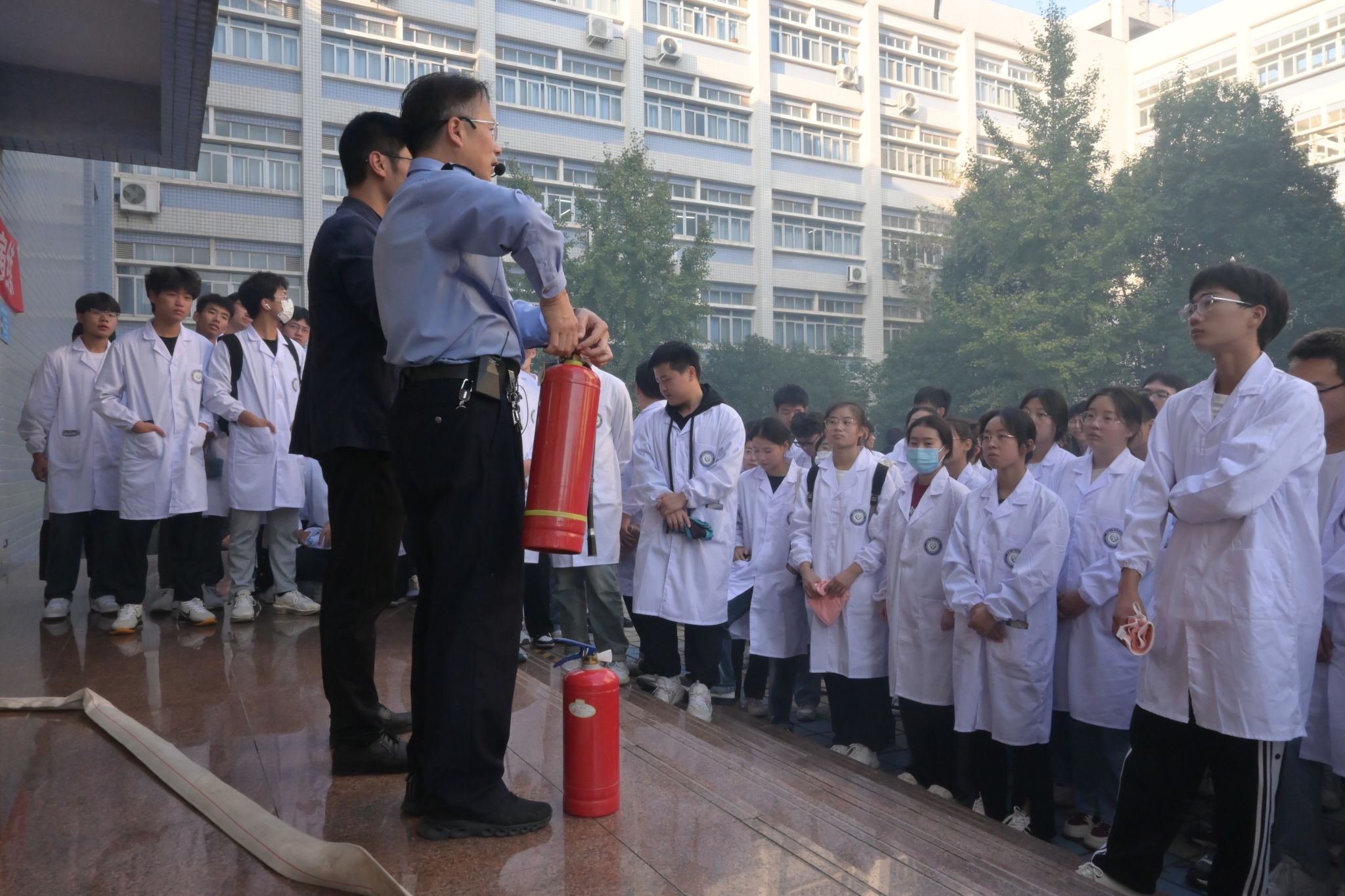 活动伊始,王洪刚处长发表动员讲话,介绍了本次演习流程并向大家阐释了实验室安全管理相关措施办法。尹国杰副院长和李晓杰老师分别向参加消防演练的全体师生详细介绍了本次演练的重要性以及相关注意事项。随着指挥员的一声哨响,预想事发地烟雾缭绕,全体人员进入紧急状态并靠墙弯腰分队列、以湿毛巾捂口鼻有序撤离。全体师生疏散撤离结束后,各楼层负责人清点人数并上报人员疏散情况,随后在场学生开展灭火实操演练。保卫处李晓杰老师向全体师生普及了防范火灾常识,化学用品的使用。并详细地介绍了各种类型灭火器的使用方法及注意事项,带领同学们使用灭火器并进行实际灭火器灭火操作和消防水枪灭火演练。