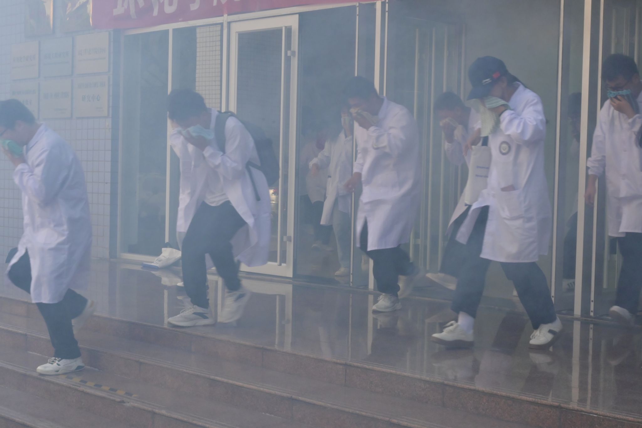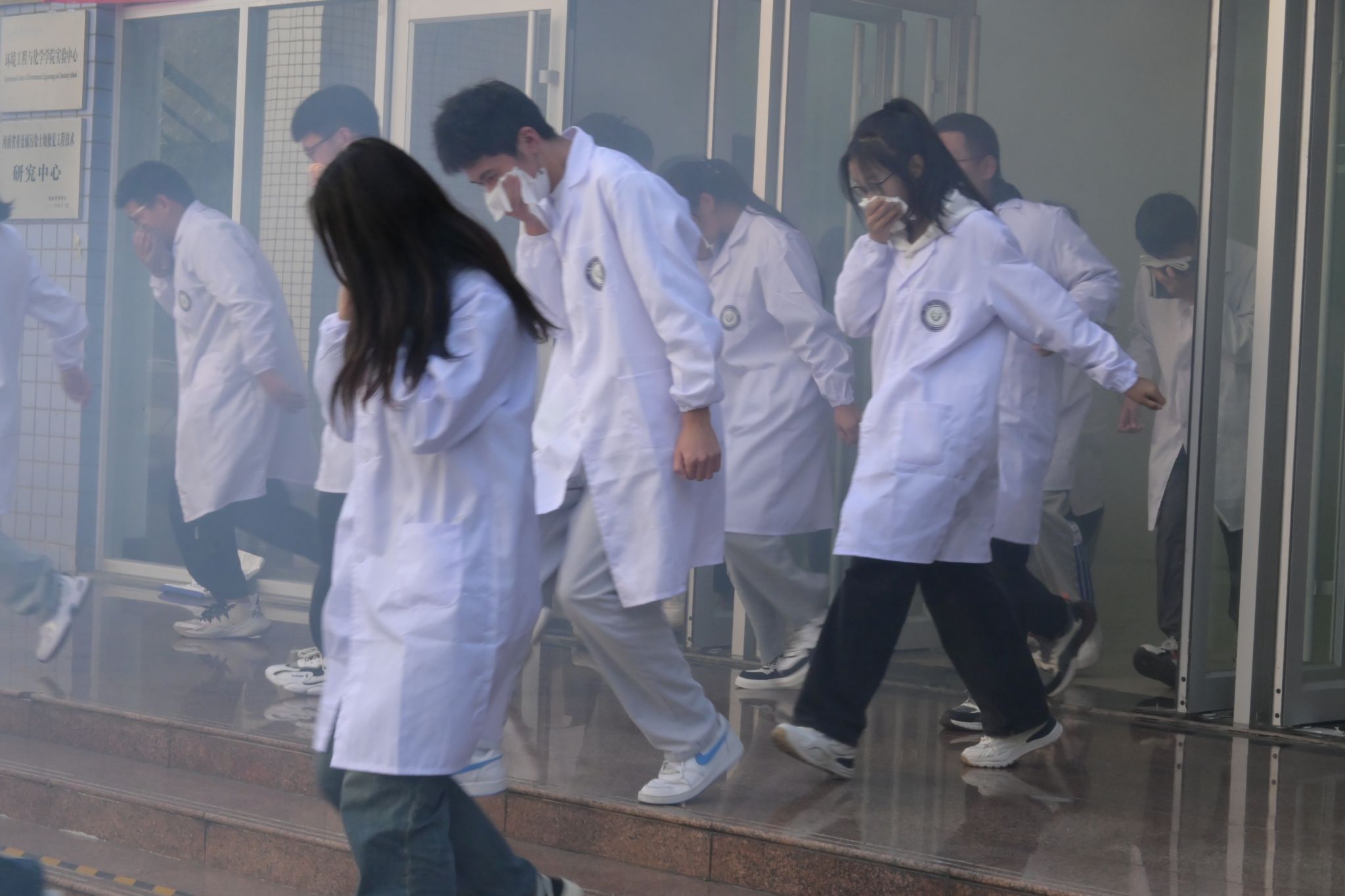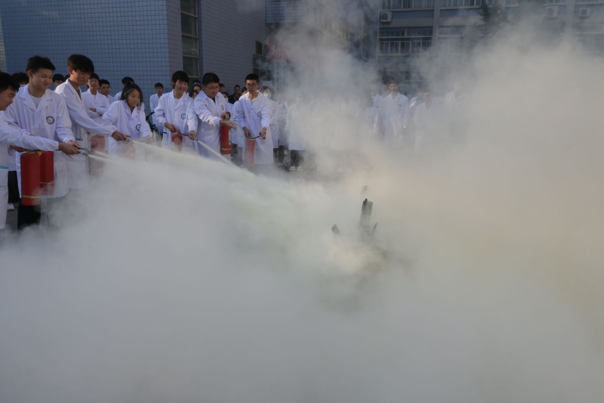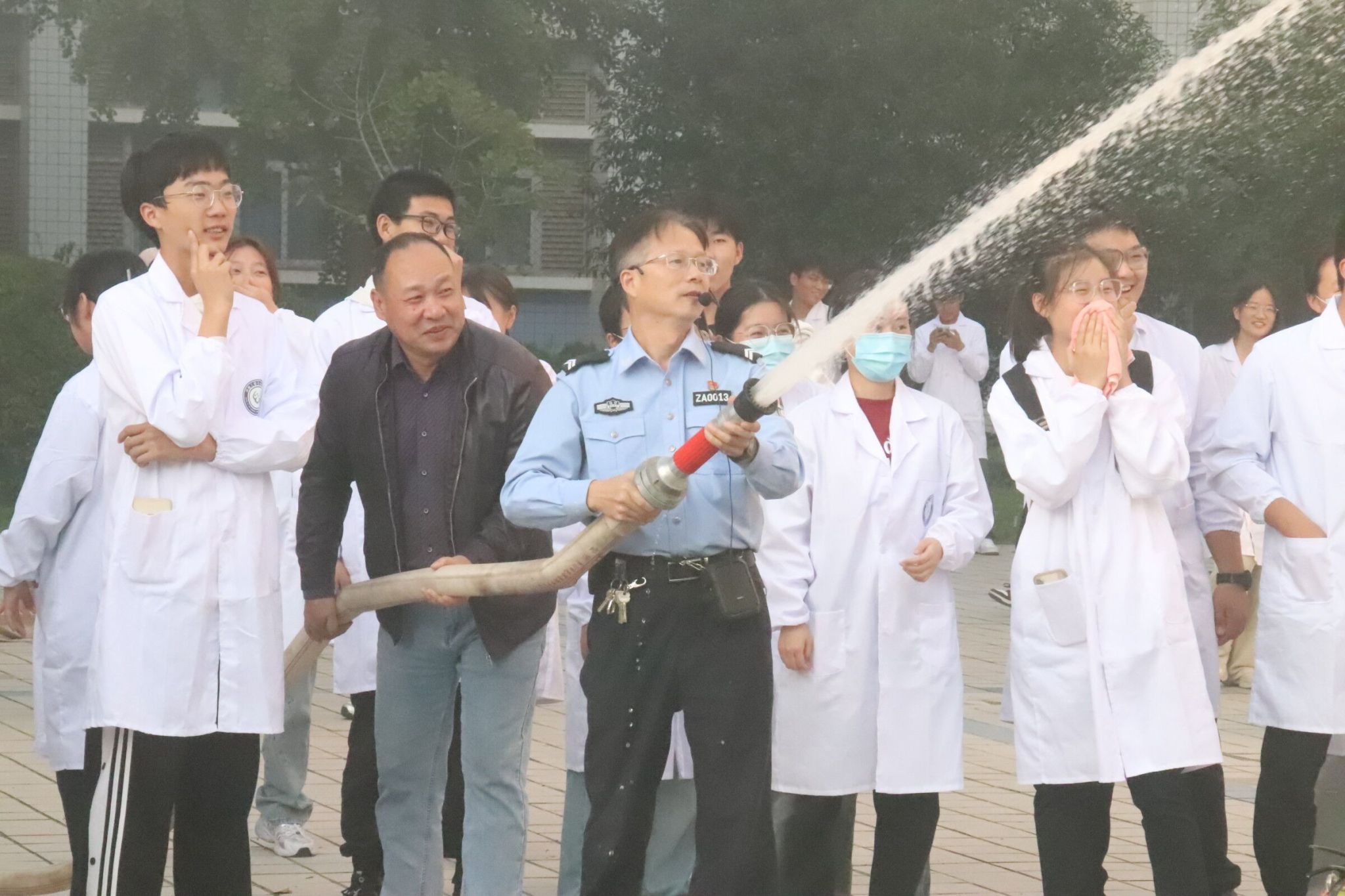 活动伊始,王洪刚处长发表动员讲话,介绍了本次演习流程并向大家阐释了实验室安全管理相关措施办法。尹国杰副院长和李晓杰老师分别向参加消防演练的全体师生详细介绍了本次演练的重要性以及相关注意事项。随着指挥员的一声哨响,预想事发地烟雾缭绕,全体人员进入紧急状态并靠墙弯腰分队列、以湿毛巾捂口鼻有序撤离。全体师生疏散撤离结束后,各楼层负责人清点人数并上报人员疏散情况,随后在场学生开展灭火实操演练。保卫处李晓杰老师向全体师生普及了防范火灾常识,化学用品的使用。并详细地介绍了各种类型灭火器的使用方法及注意事项,带领同学们使用灭火器并进行实际灭火器灭火操作和消防水枪灭火演练。