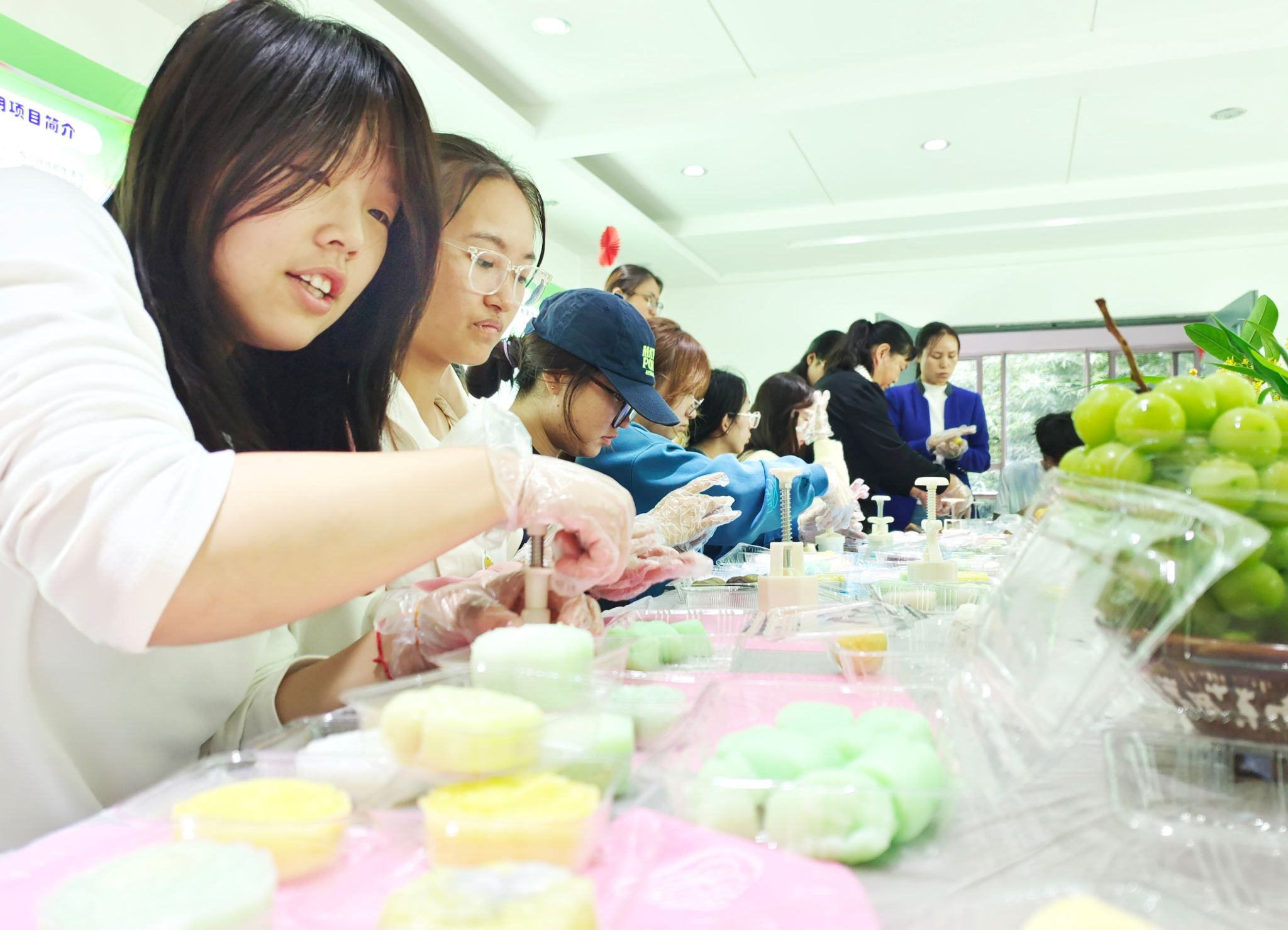 匠心揉面,味形双绝。活动精心筹备了时下热门的冰皮与桃山皮两种饼皮,满足不同口味偏好:冰皮月饼外皮晶莹剔透,入口软糯 Q 弹,自带清爽质感;源自日本的桃山皮则奶香醇厚,质地细腻易塑形,为同学们的创意发挥留出了充足空间。馅料选择更是兼顾经典与新意,除了承载童年记忆的绿豆沙、红豆沙、枣泥等传统口味,还特别准备了酸甜爽口的凤梨馅、果香浓郁的蓝莓馅,让每一份喜好都能被满足。从揉匀饼皮、精准称重,到包裹馅料、压模成型,同学们在专业面点师与公寓阿姨的耐心指导下,一步步褪去 “新手” 生涩,渐渐熟练掌握技巧,指尖的月饼也愈发精致。