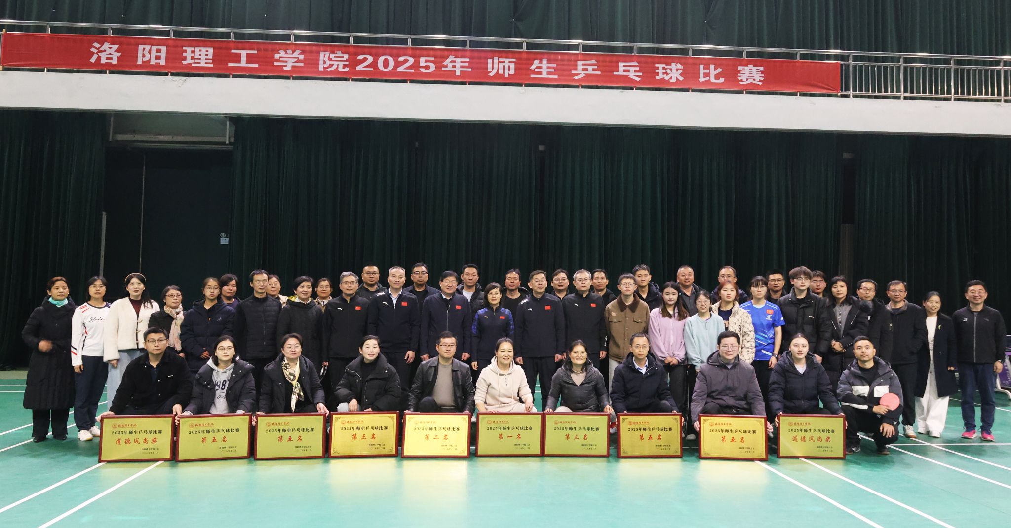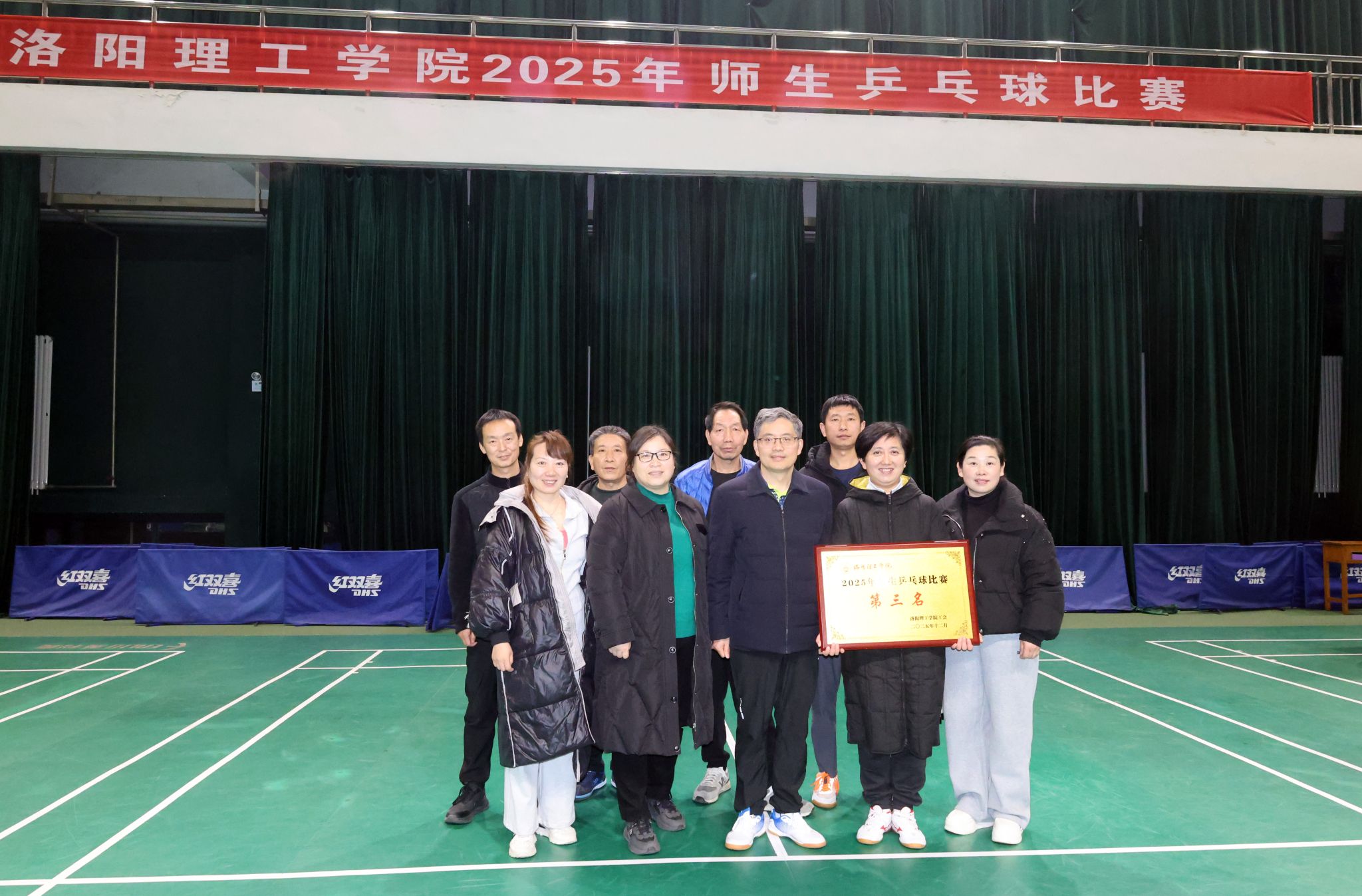 12 月 18 日,伴随着阵阵掌声,我校 2025 年师生乒乓球比赛在王城校区体育场正式闭幕。校领导出席闭幕式,为在赛事中取得优异成绩的队伍颁发奖牌。