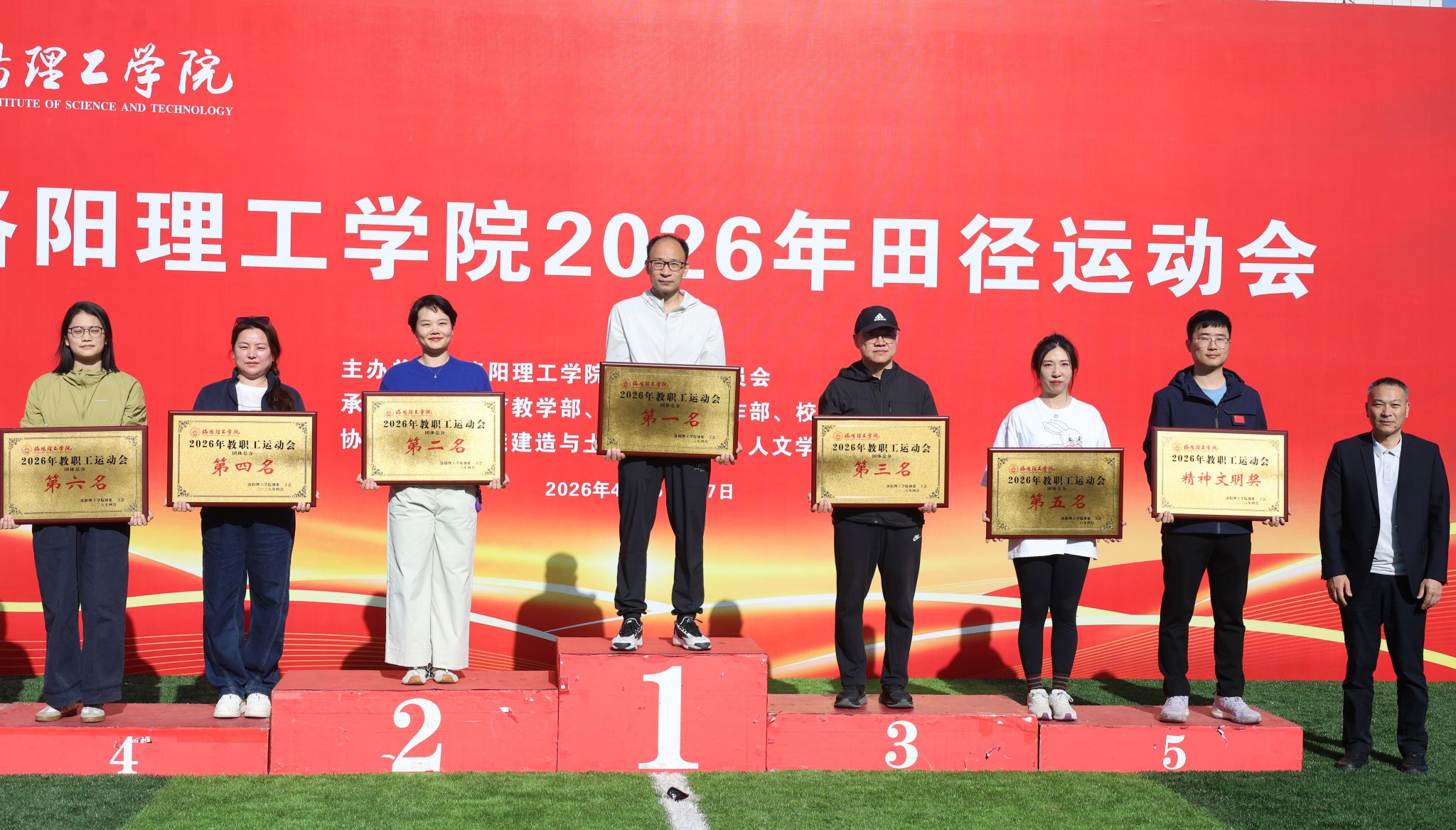 4月17日下午,我校2026年田径运动会顺利落下帷幕。本次运动会上,后勤参赛选手奋勇争先、永不言弃,用汗水诠释责任与担当,展现了昂扬向上、奋勇拼搏的精神风貌,凭借彼此间的默契配合与不懈拼搏,荣获教工组团体总分第二名的优异成绩。