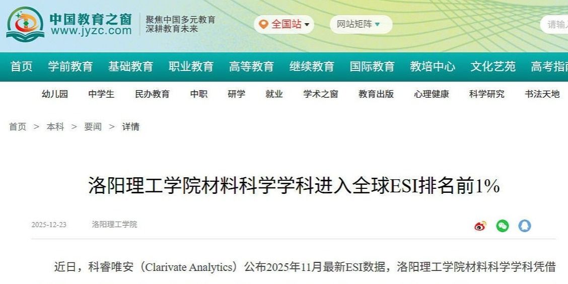中国教育之窗、高校之窗报道我校材料科学学科进入全球ESI排名前1%