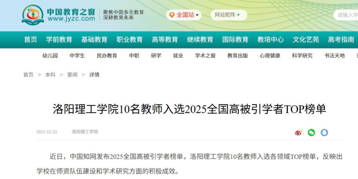 中国教育之窗、高校之窗报道我校10名教师入选2025全国高被引学者TOP榜单