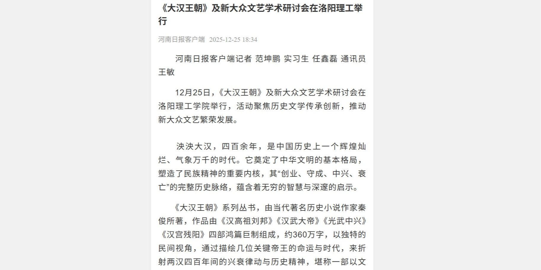河南日报、中国纪实文学研究会、河南高教等媒体报道《大汉王朝》及新大众文艺学术研讨会在我校举行